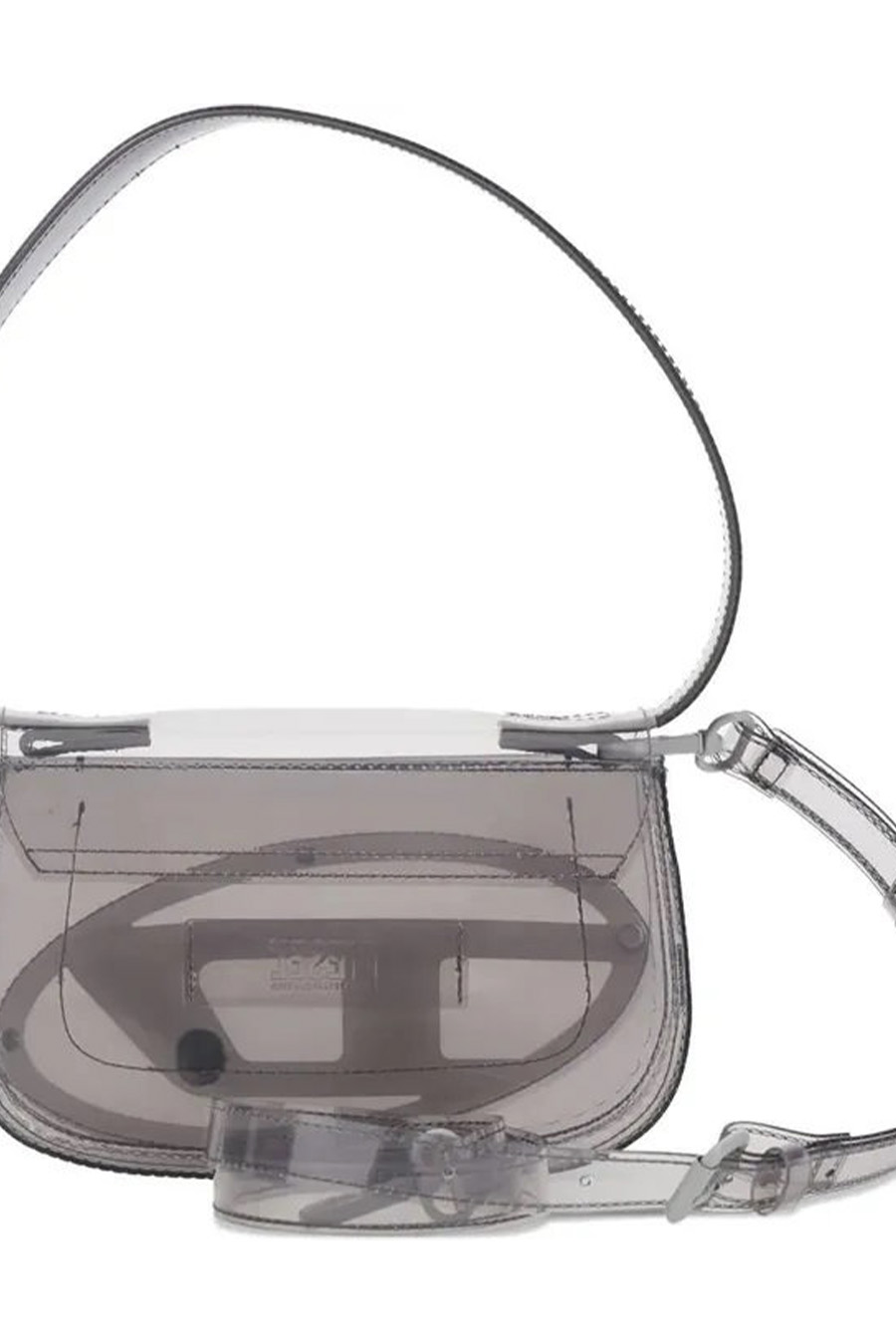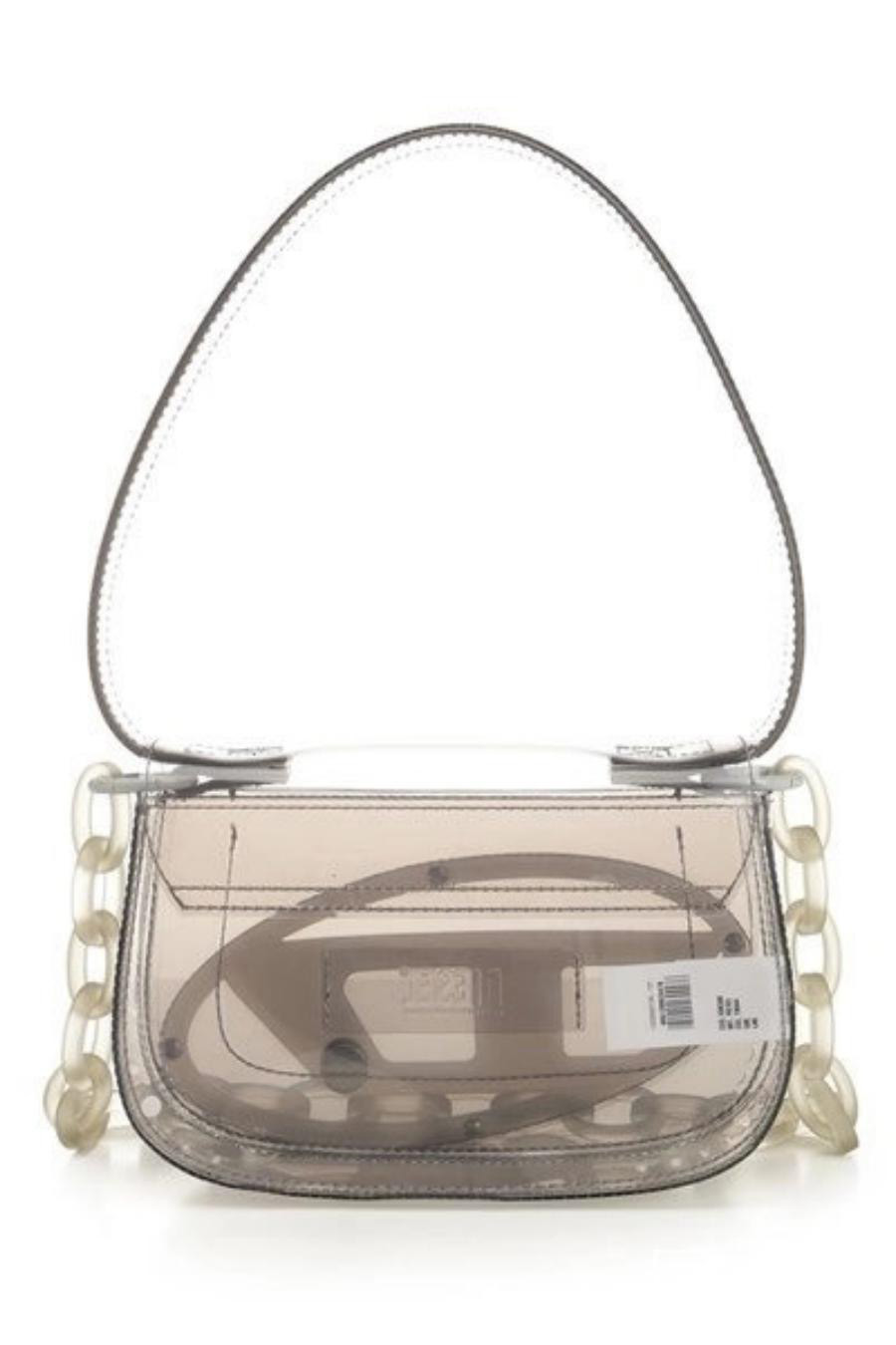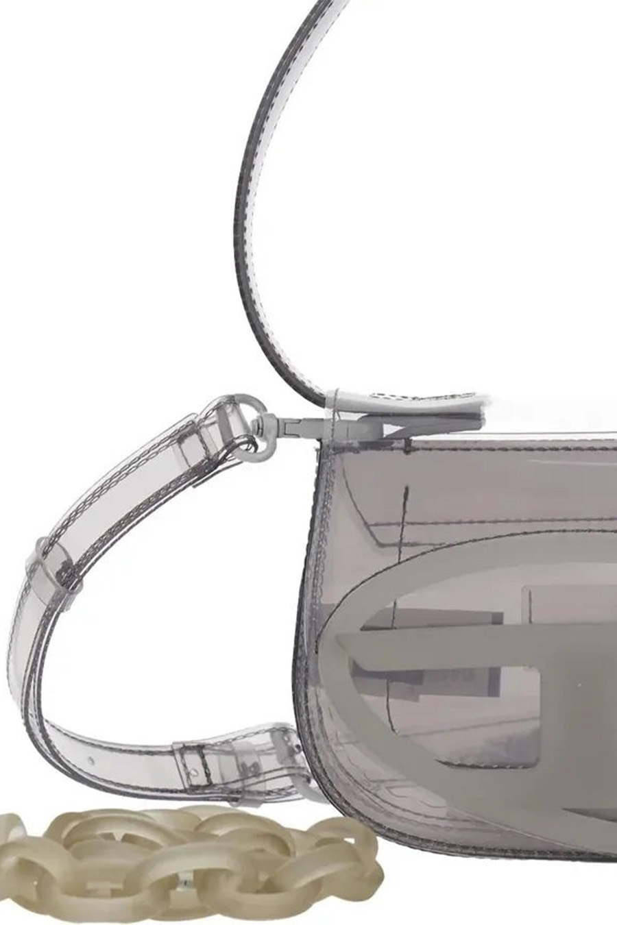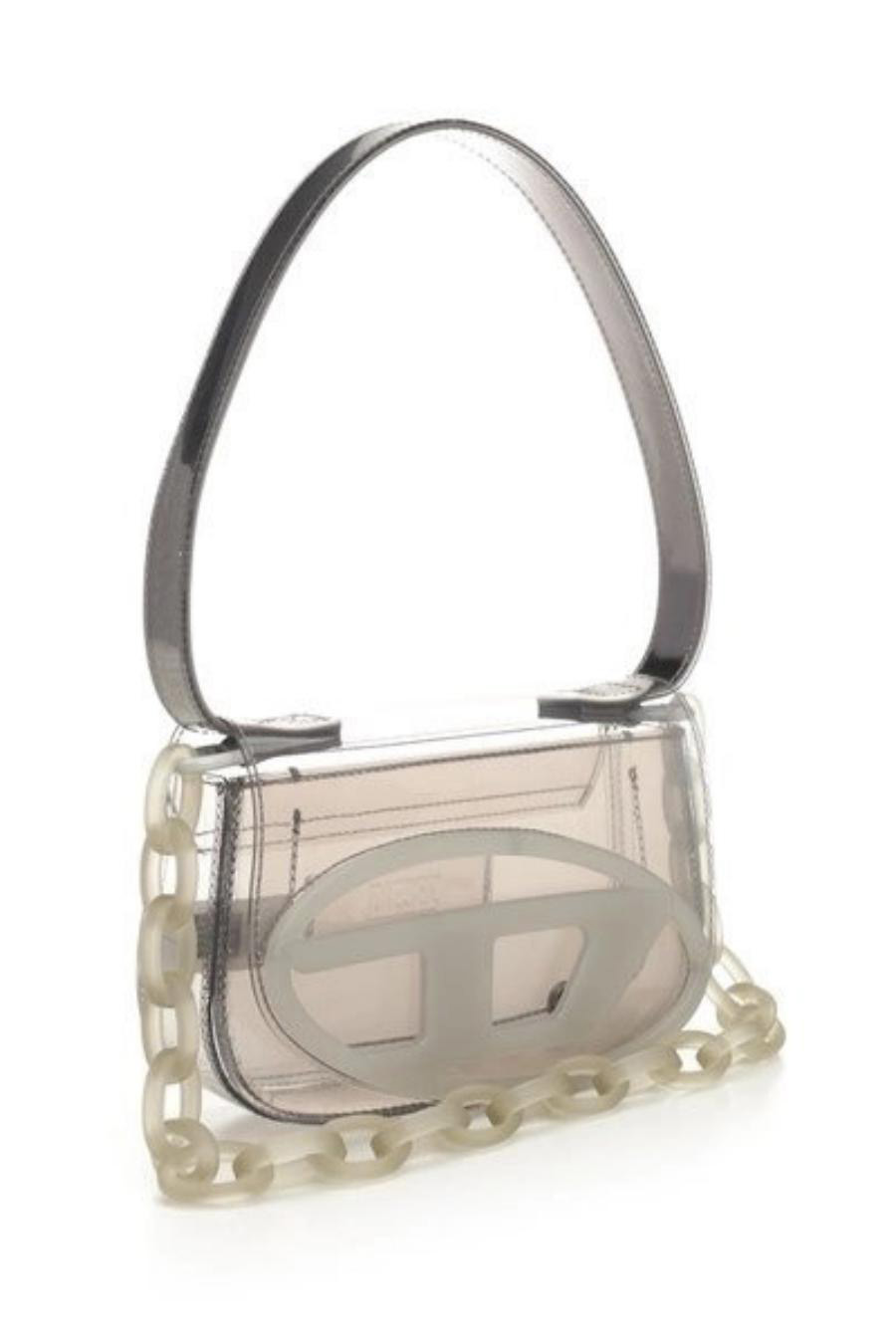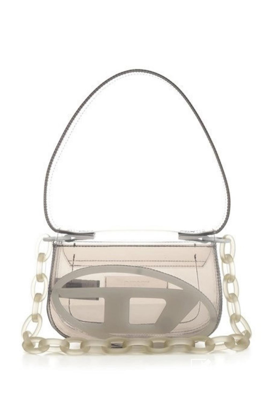 Diesel's iconic 1DR bag is crafted from flexible TPU with a colourful jelly-effect finish. It is complemented by a mirrored leather handle and matching resin accessories, including the classic Oval D plaque and chunky chain that also serves as a handle.