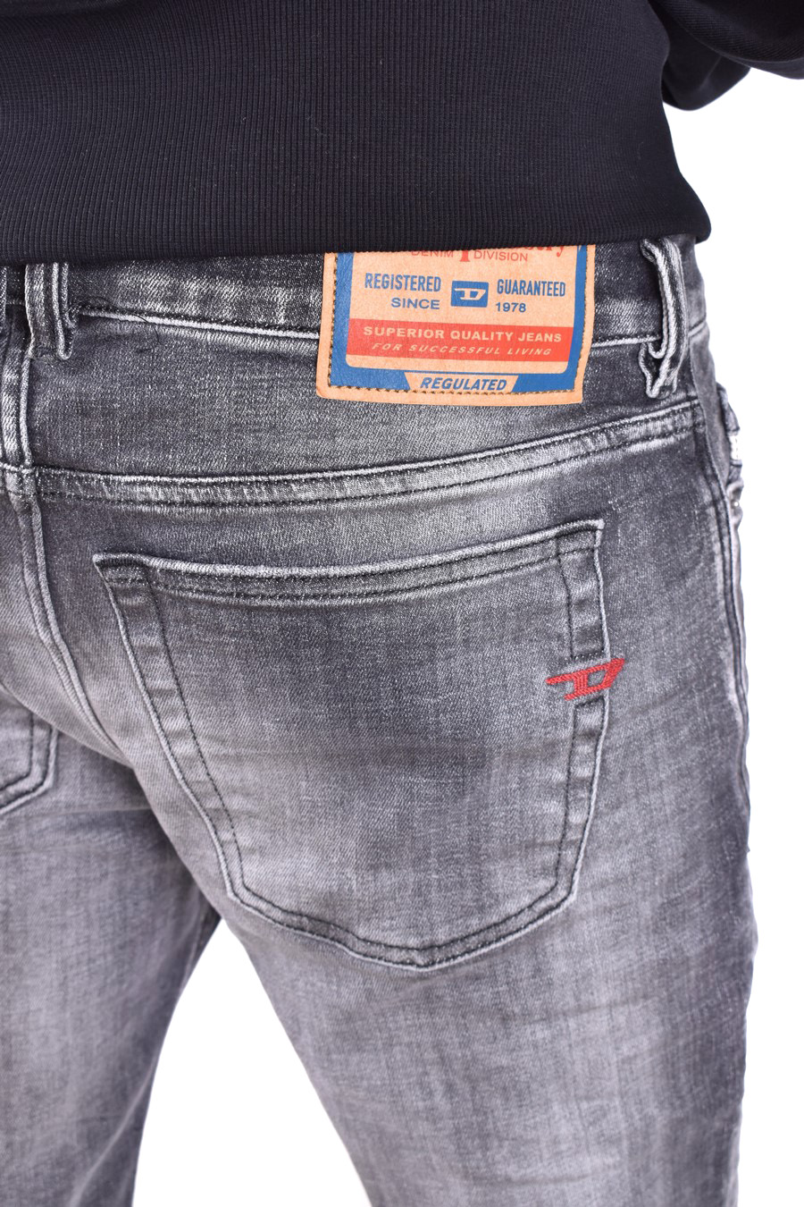 black jeans from Diesel featuring front zip and button fastening, classic five pockets, belt loops, logo embroidered rear pocket, slim fit