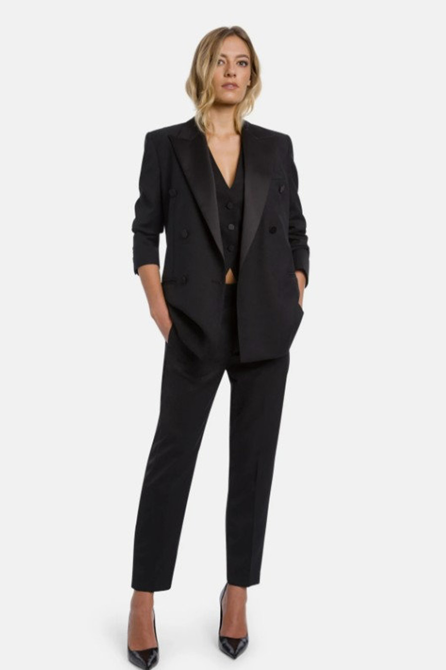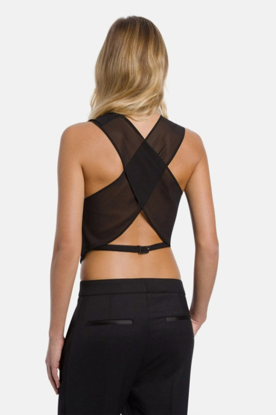 Slim-fit Dondup gabardine wool blend waistcoat with V-neckline, three covered buttons, welt pockets and voile crossover back.