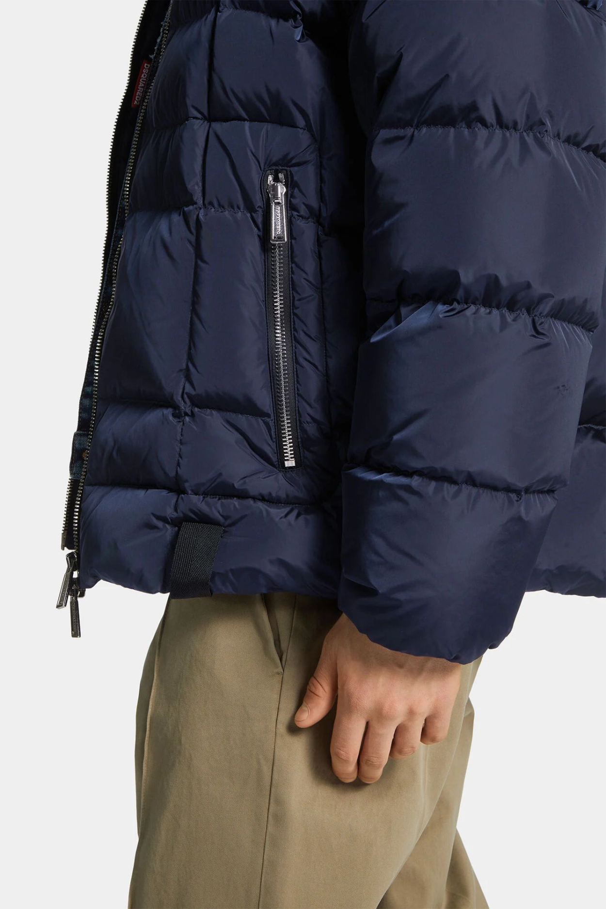 3D Down Jacket DQUARED2 long nylon down jacket with hood, large zipped pockets and drawstring at the bottom to block the wind.