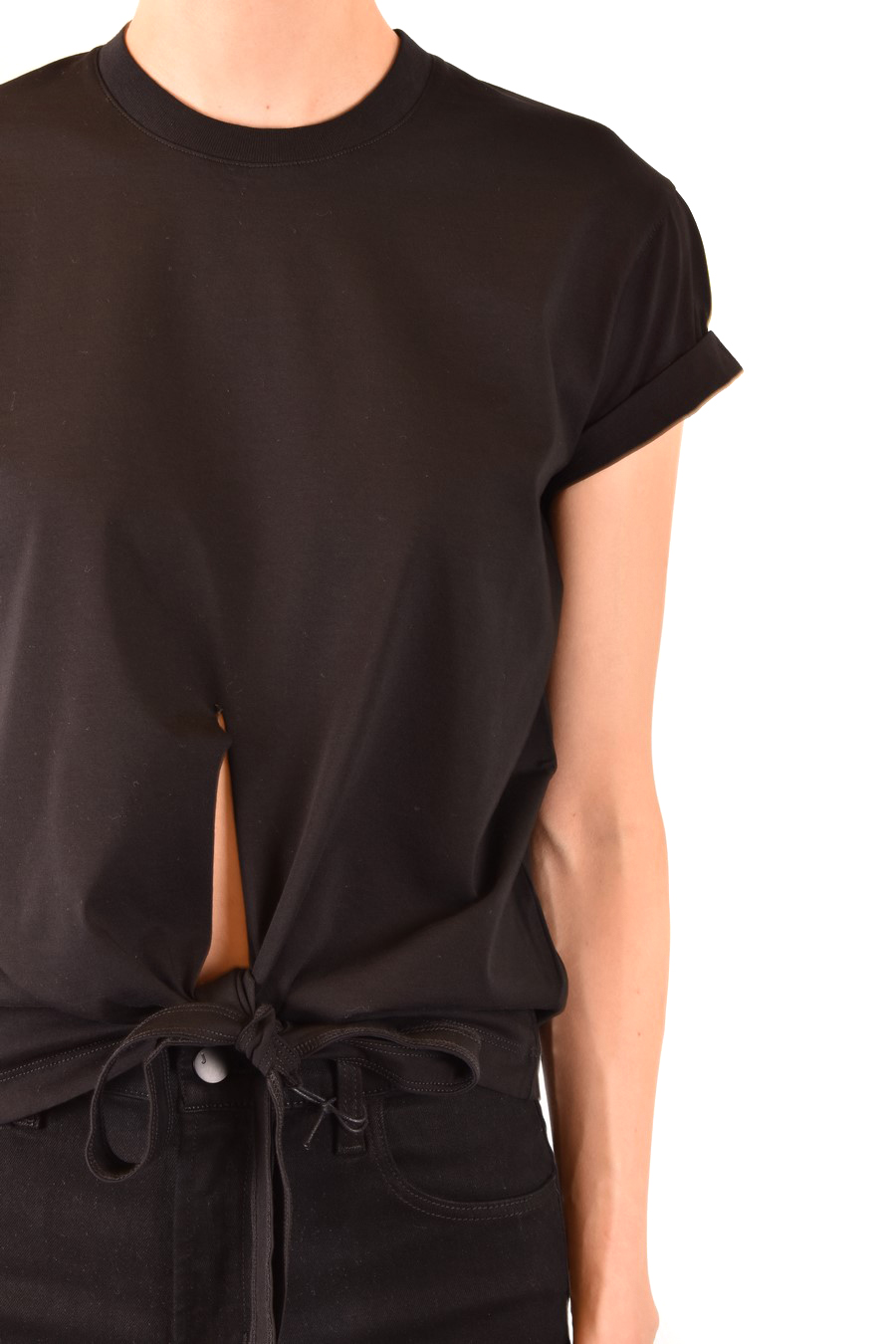 black cotton t-shirt from Dsquared2 featuring round neck, short sleeves, white print back, deep slit and knot fastening to the front