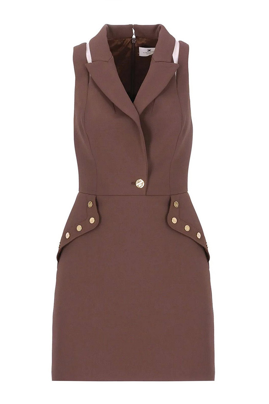 Elisabetta Franchi mini dress in double stretch crêpe with logo details, sleeveless with straps and peaked lapels, the skirt features side flaps that create a unique silhouette.