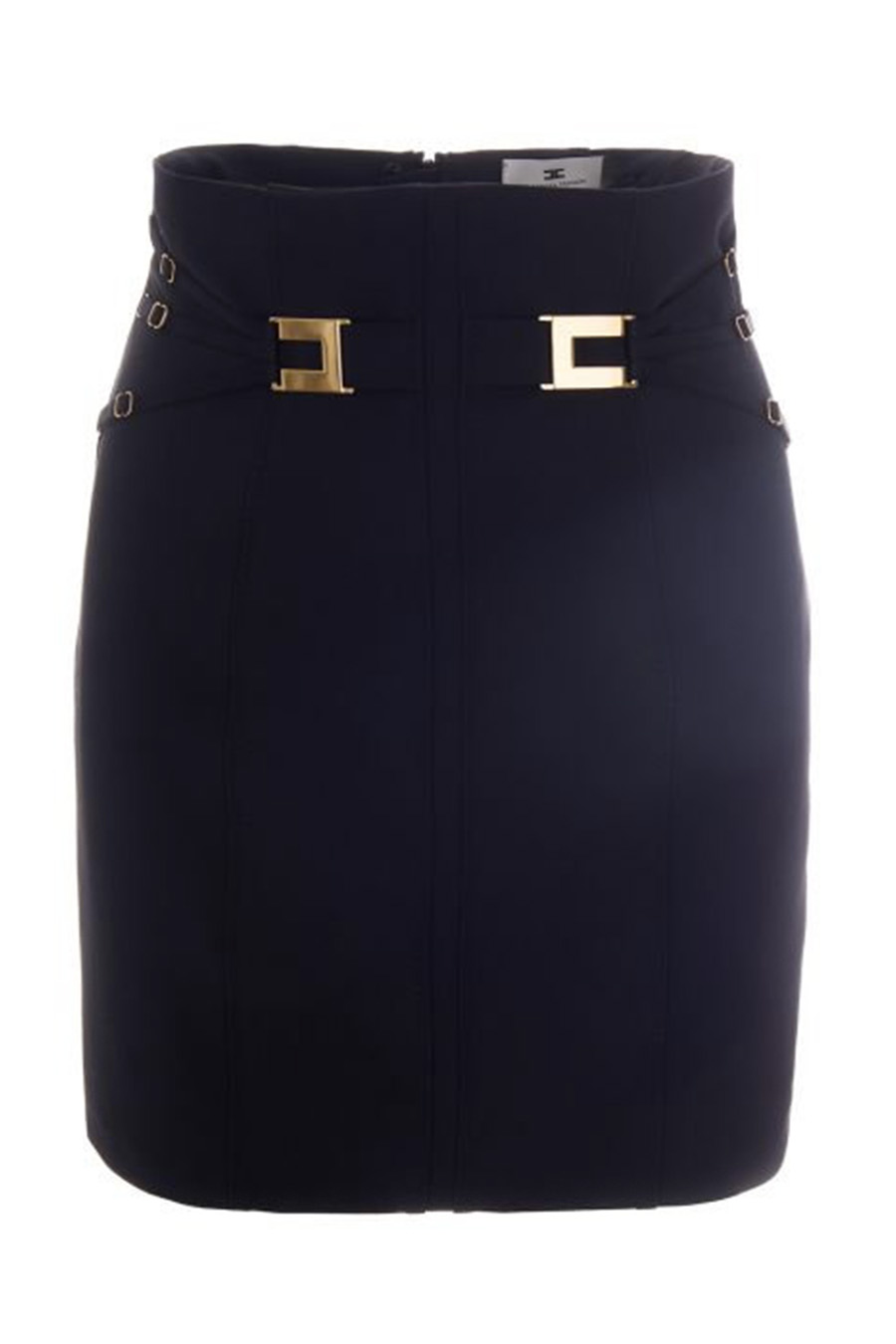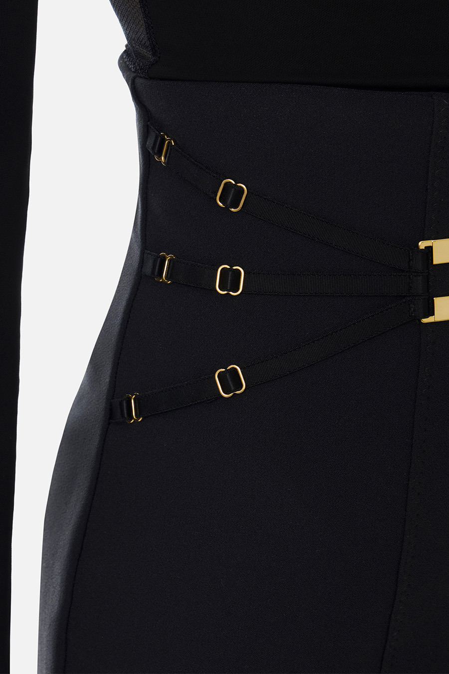 Elisabetta Franchi knit top with bare shoulders and long sleeves held in place by a golden metal jewel detail that illuminates the neckline.