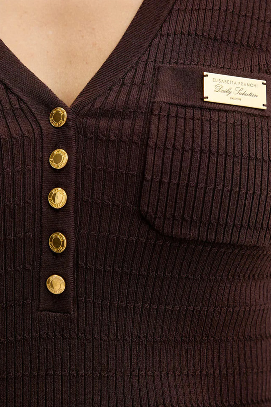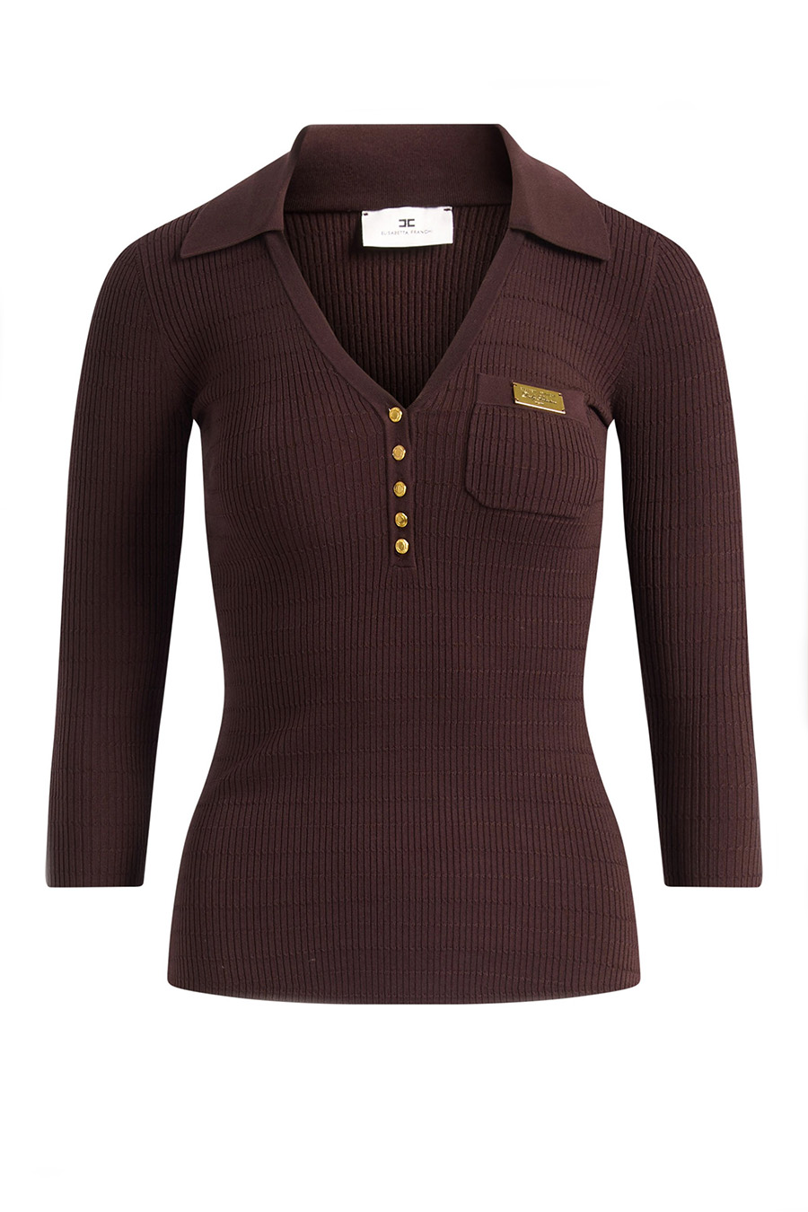 Elisabetta Franchi micro-braided knit polo shirt with long sleeves, gold metal buttons and logo and lettering plaque on the pocket.