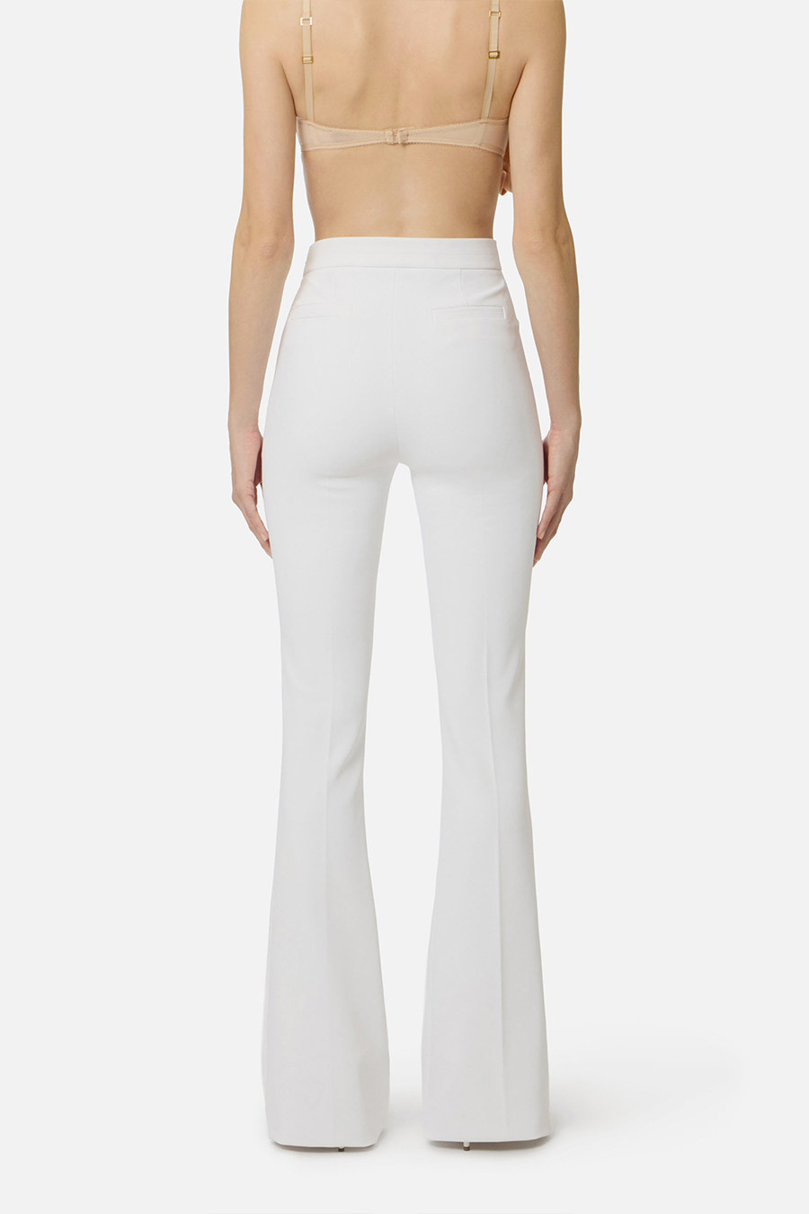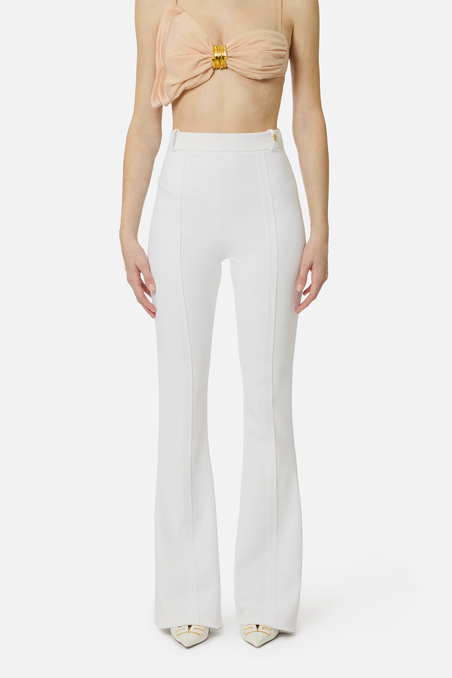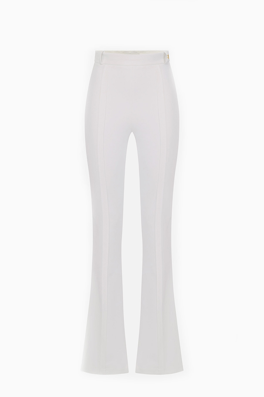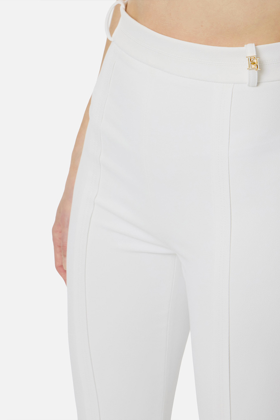Elisabetta Franchi double stretch crepe trousers with logo on one belt loop, side slits emphasised by external stitching, finished with raw-cut fabric and topstitching.