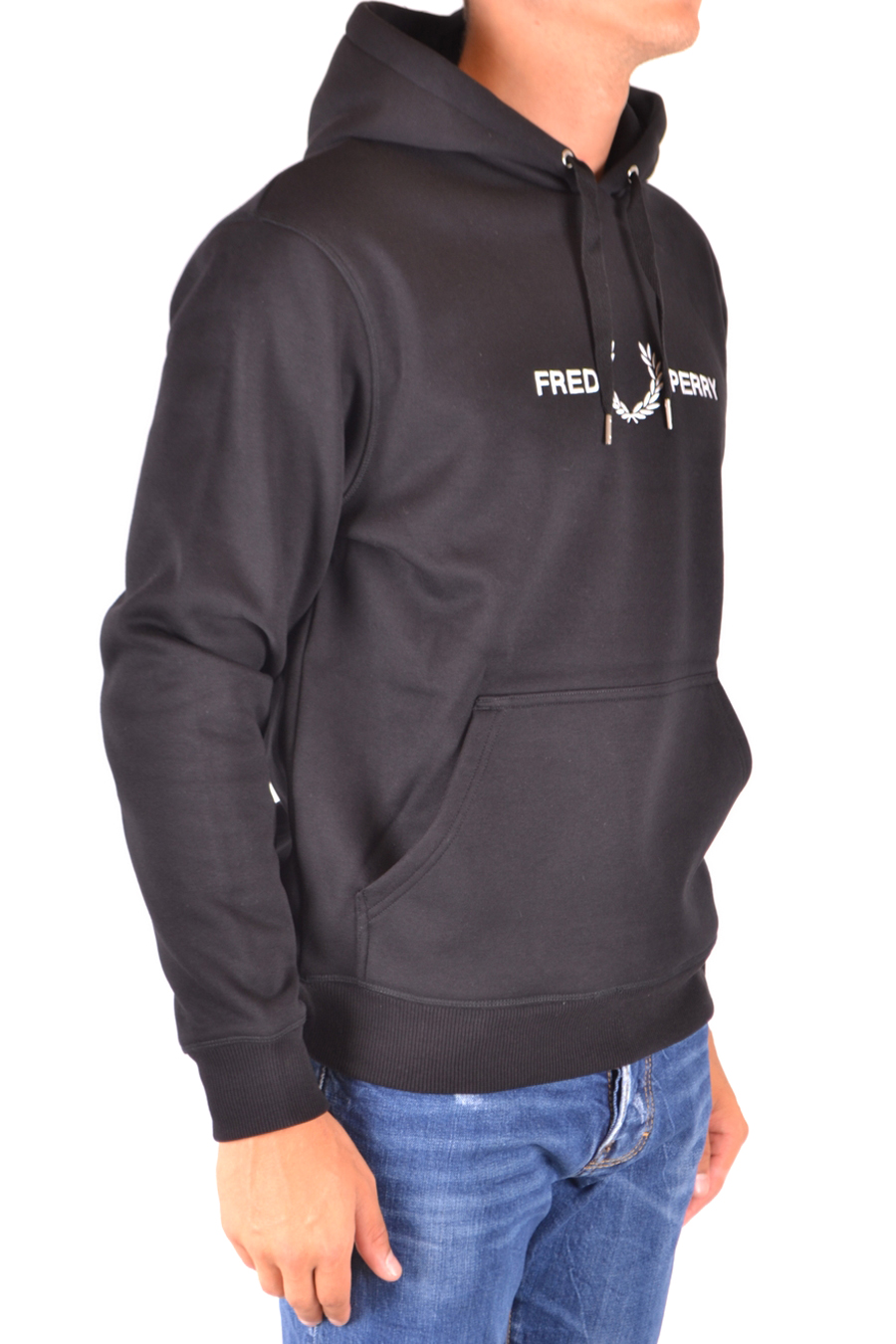black cotton blend hoodie from fred perry featuring hood drawstring, kangooro pocket, long sleeves, logo embroideed in front, hem and cuffs ribbed
