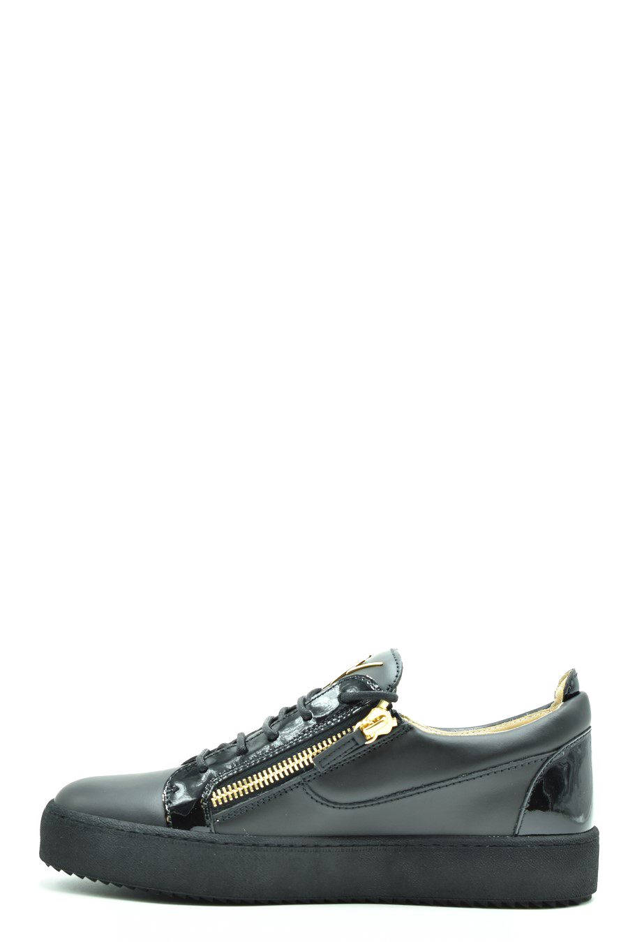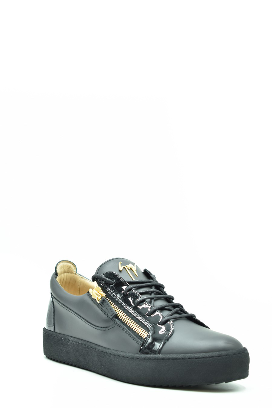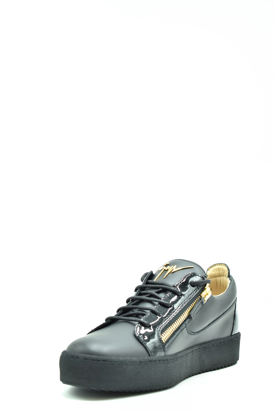 Leather and patent leather low-top lace-up trainer with double side zip and rubber sole.