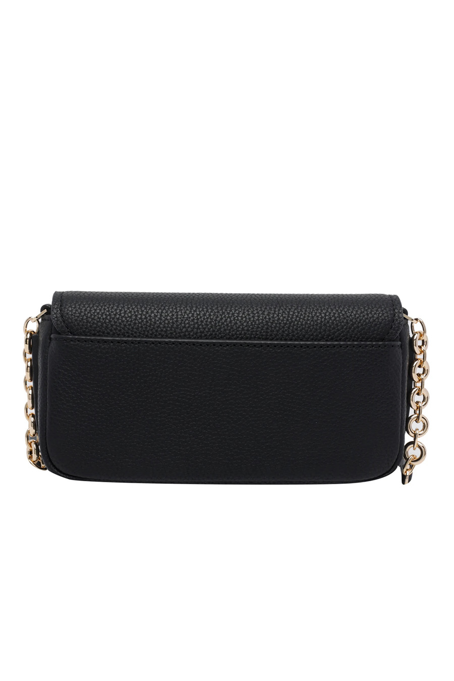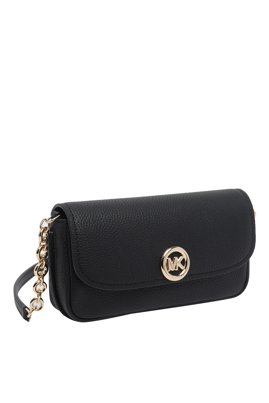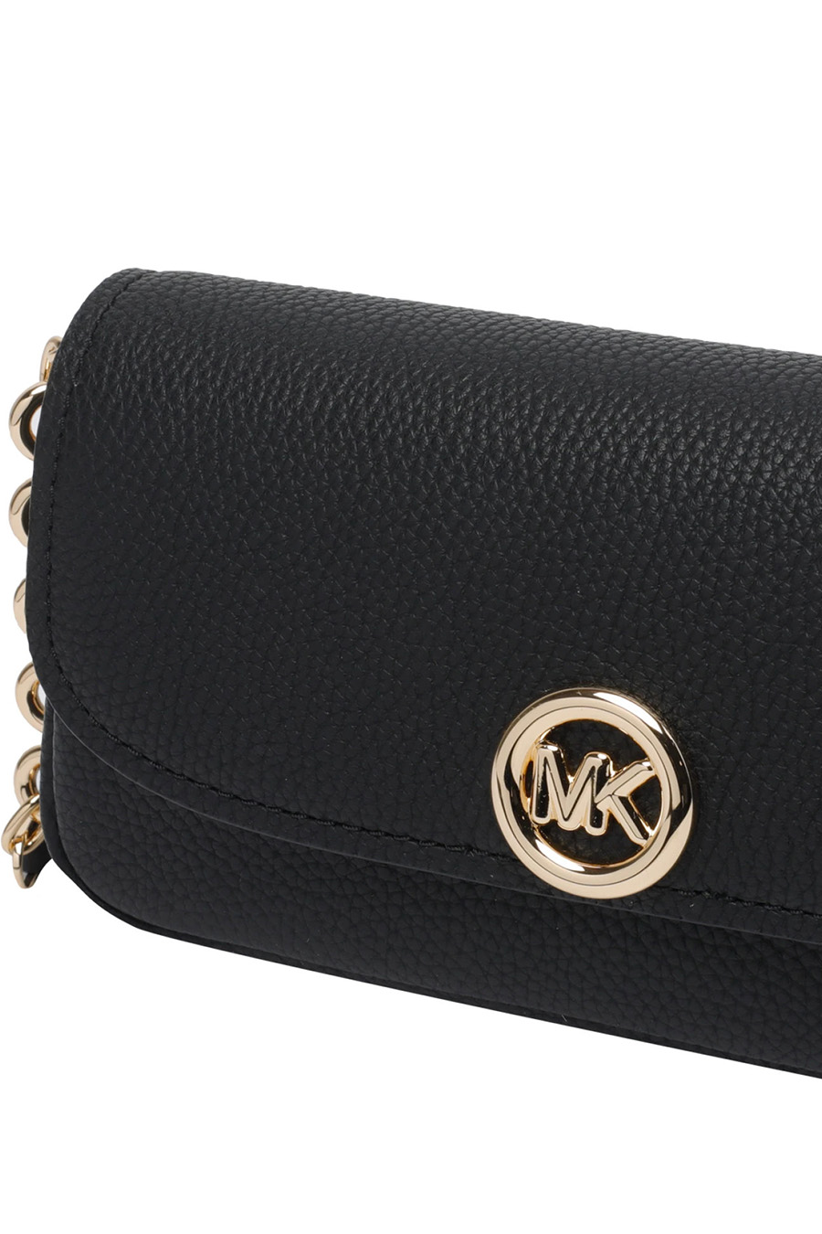 Small Nolita shoulder bag by Michael Kors, crafted from textured leather, featuring a compact silhouette with a secure snap closure interior. A leather and chain shoulder strap allows for comfortable hands-free wear.