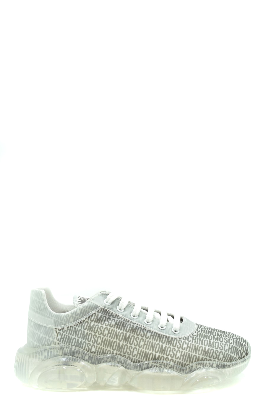 grey sneakers from Moschino featuring front lace-up fastening, monogram pattern, upper fabric-blend, round toe, chunky rubber sole