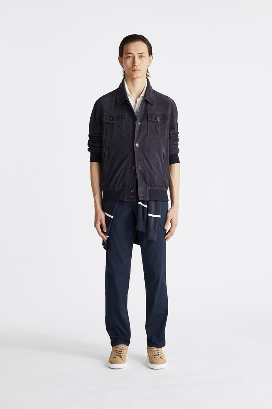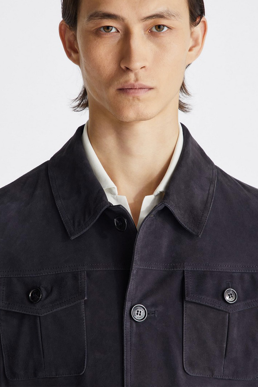 The central fastening with elegant horn-effect buttons, the two buttoned chest pockets and the side pockets add distinctive details to the design.