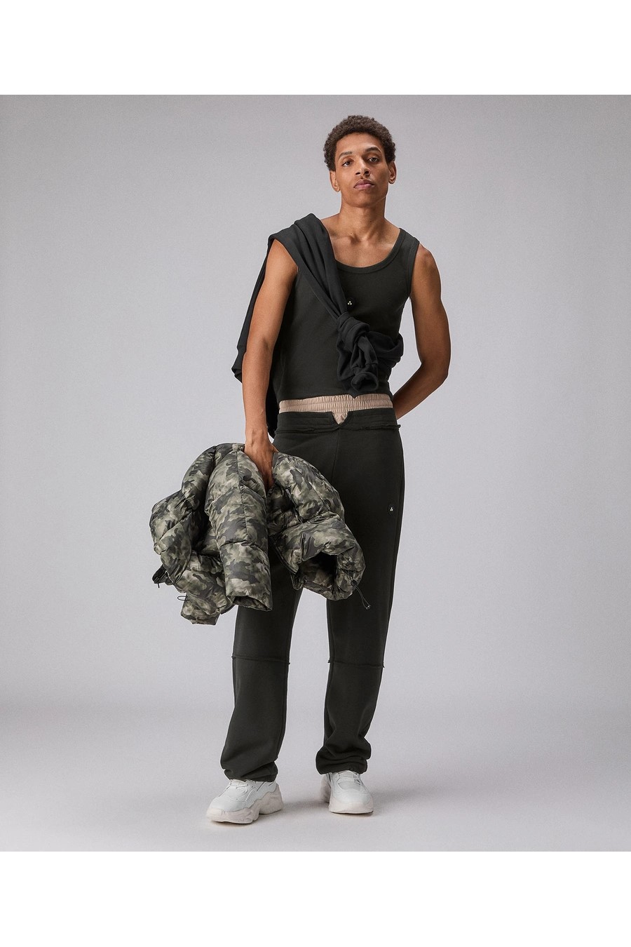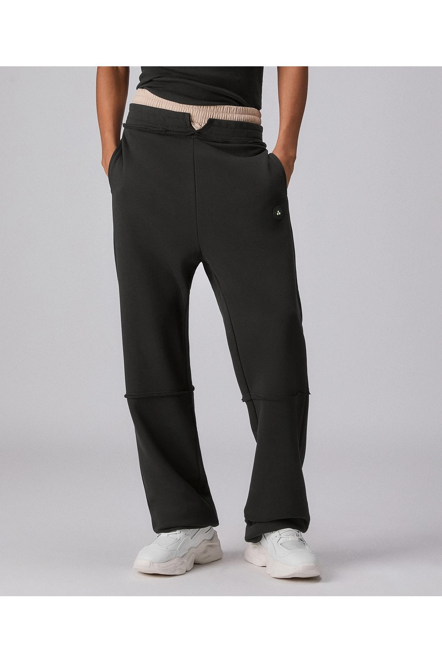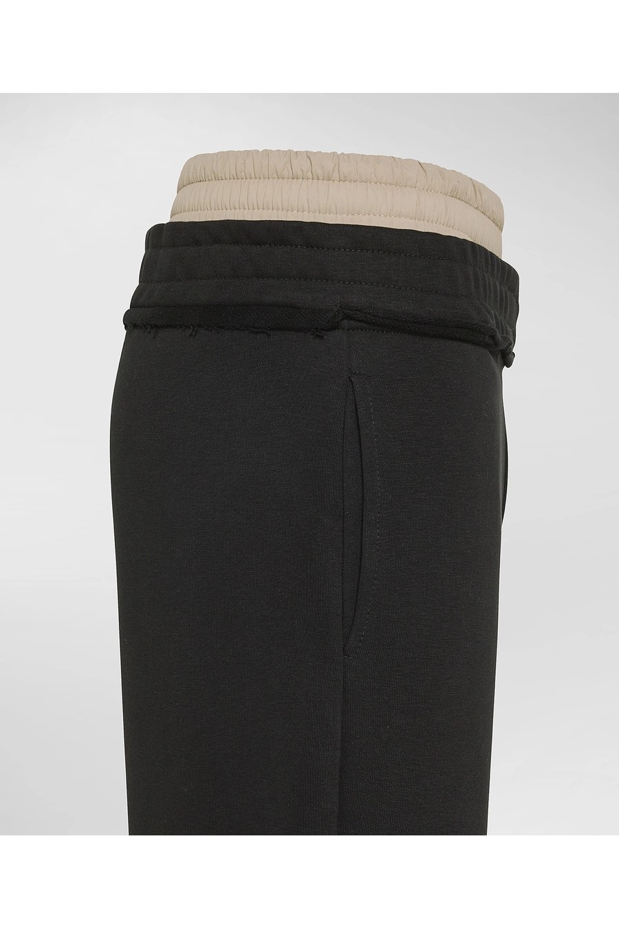 Peuterey joggers in 100% cotton with a double-trouser effect: the upper band with contrasting fabric elastic creates the illusion of high-waisted boxer shorts emerging from the trousers.