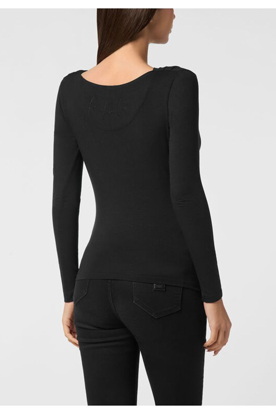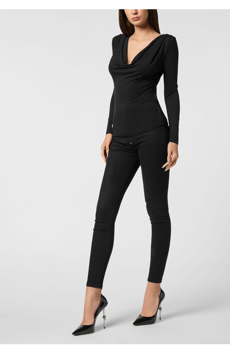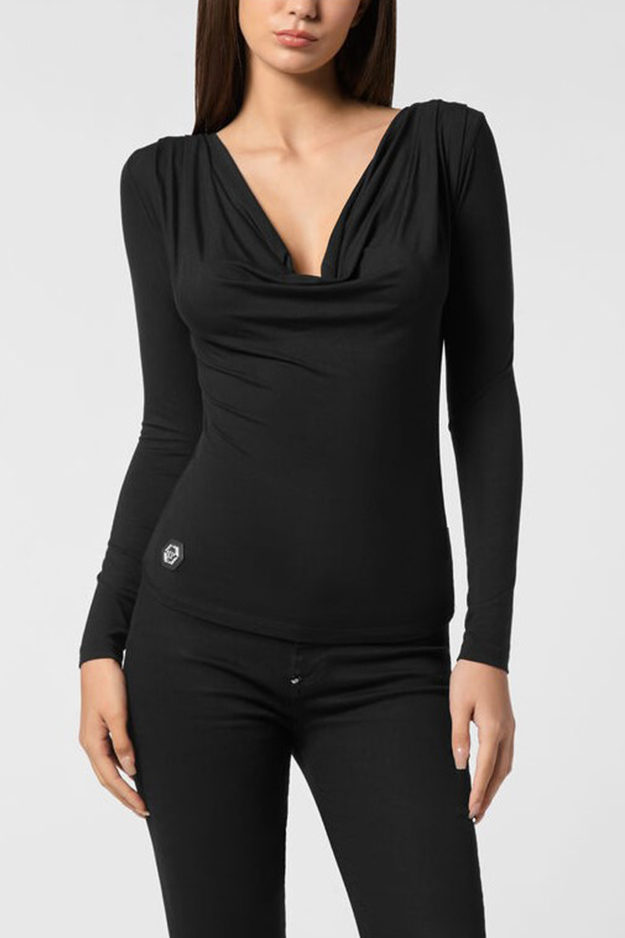 Philipp Plein long-sleeved hooded sweater in modal featuring a draped neckline, embroidered lettering on the yoke and double-needle stitched edges.