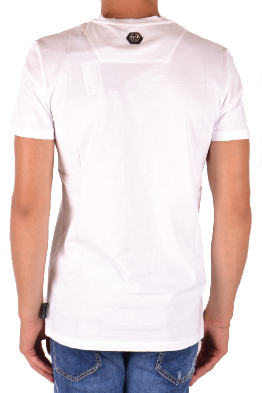 white cotton t-shirt from philipp plein featuring round neck, short sleeves, rhinestones logo print in front, straight hem