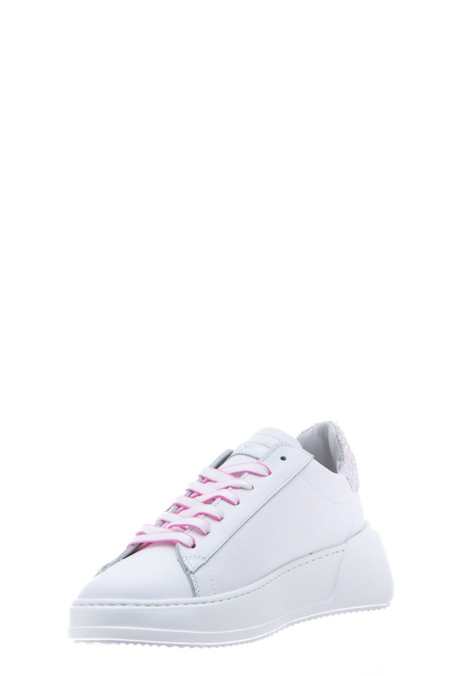 white sneackers from Philippe Model featuring tonal stitching, logo patch at the tongue, logo patch to the side, round toe, front lace-up fastening, branded insole, chunky rubber sole