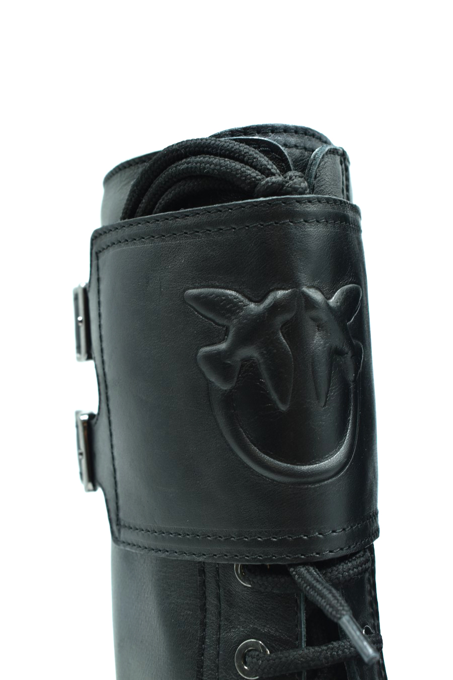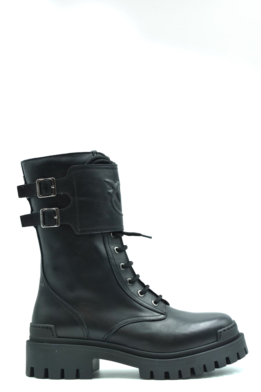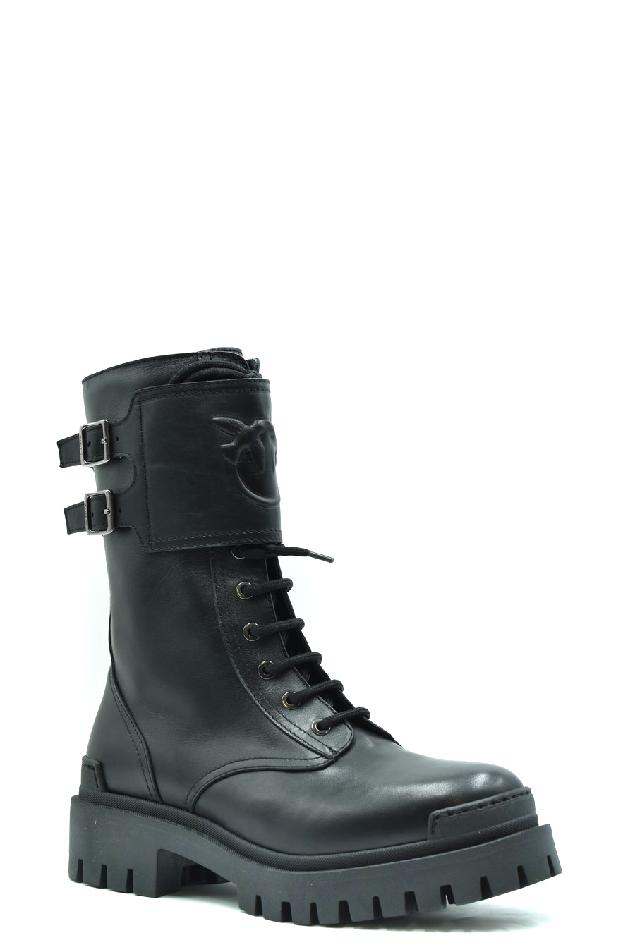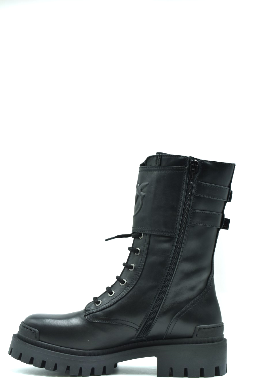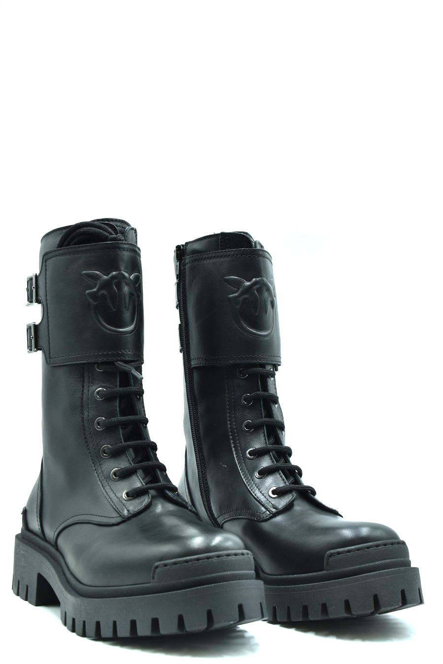 black leather boots from Pinko featuring front lace-up fastening, side zip fastening, round toe, logo lettering, knee-high, rubber lug sole