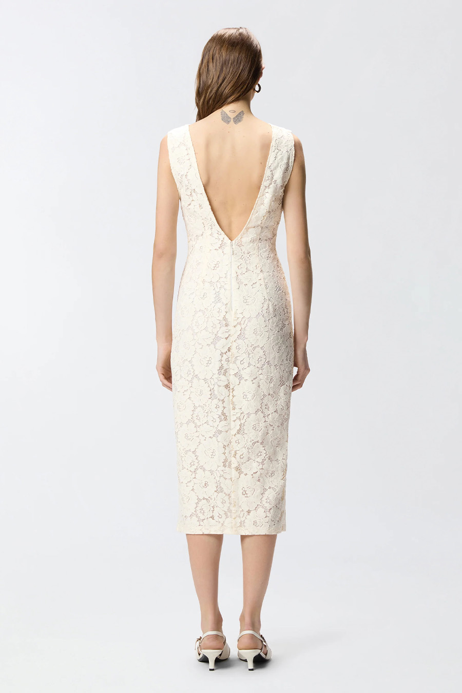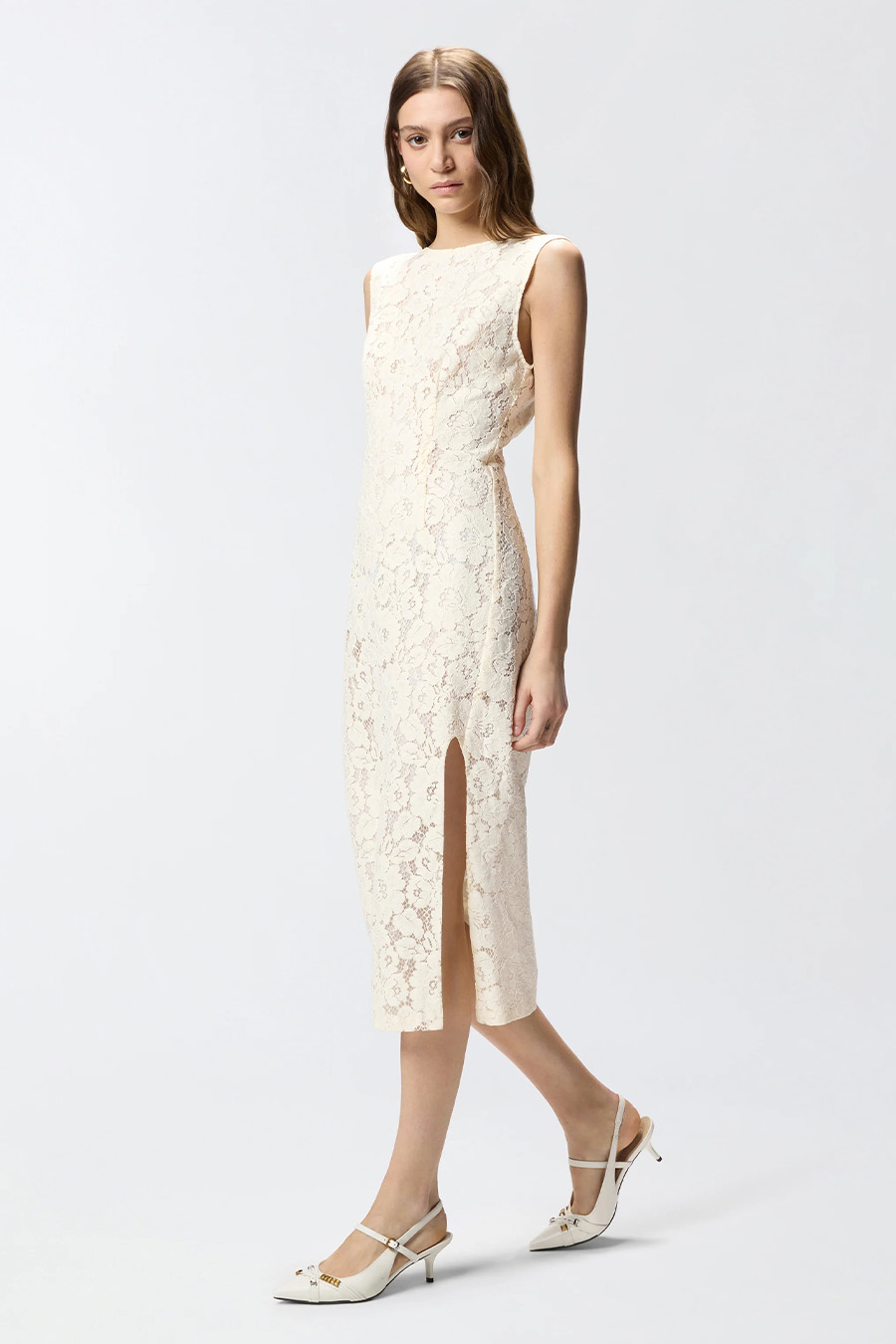 Floral lace dress with back neckline PINKO from the fitted line, sleeveless with a boat neckline at the front that opens into a deep V-neckline, the fabric is a sophisticated rebrodé lace with rich floral motifs embroidered to create a three-dimensional effect, featuring a convenient zipper at the back and an inner lining, finished with a pleated panel at the back that adds depth and a side slit at the front.
