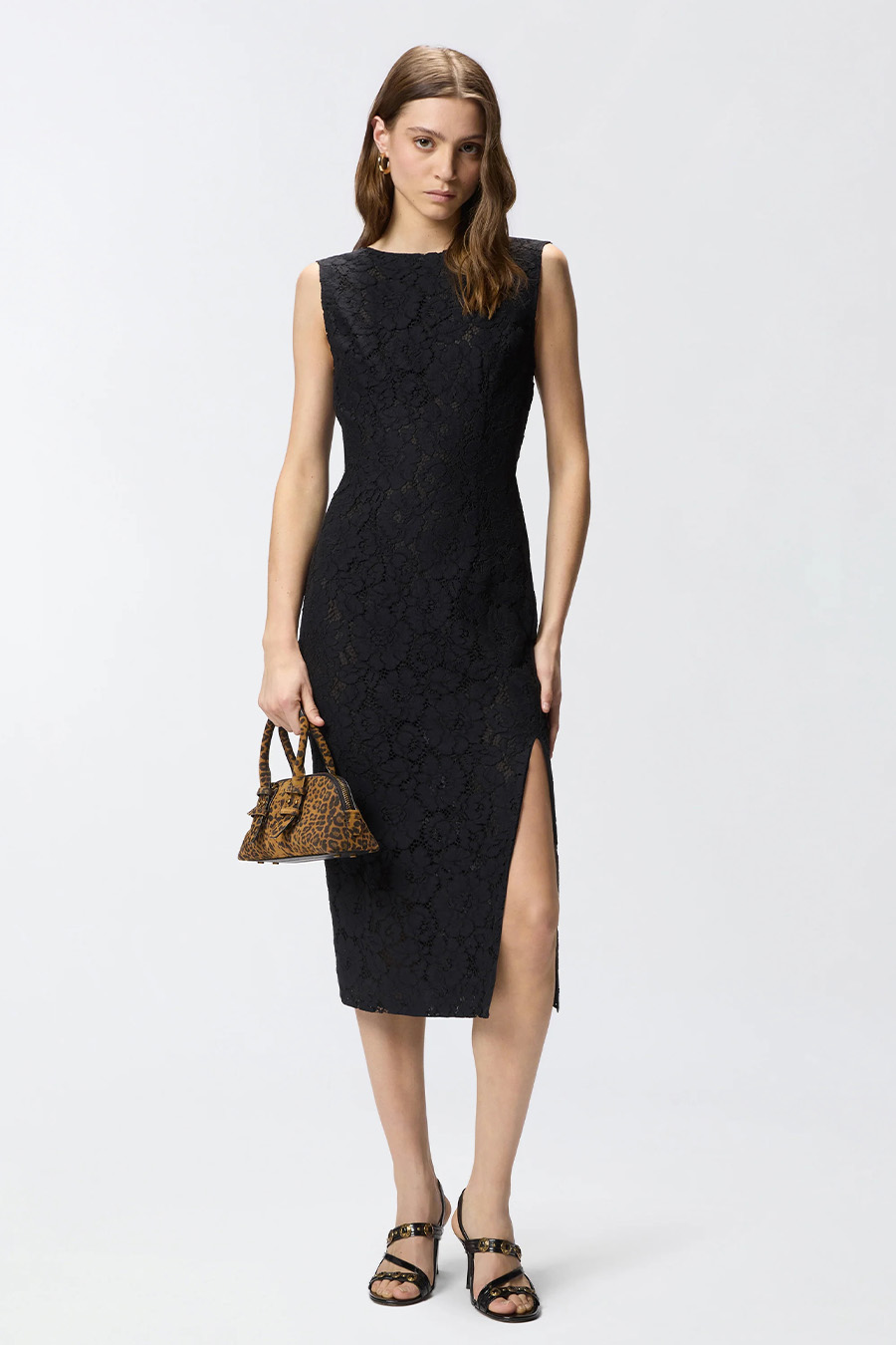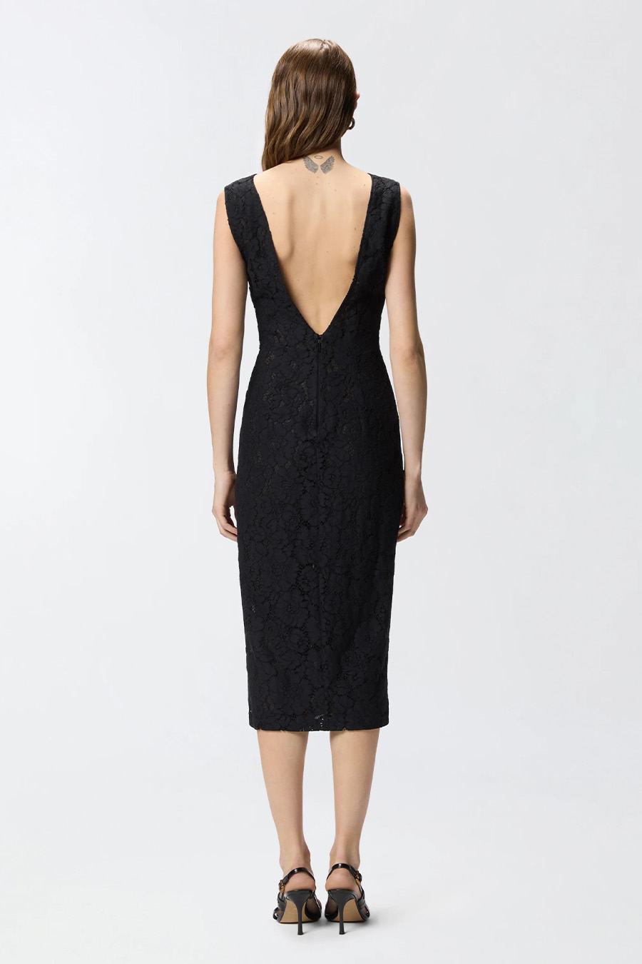 Floral lace dress with back neckline PINKO from the fitted line, sleeveless with a boat neckline at the front that opens into a deep V-neckline, the fabric is a sophisticated rebrodé lace with rich floral motifs embroidered to create a three-dimensional effect, featuring a convenient zipper at the back and an inner lining, finished with a pleated panel at the back that adds depth and a side slit at the front.