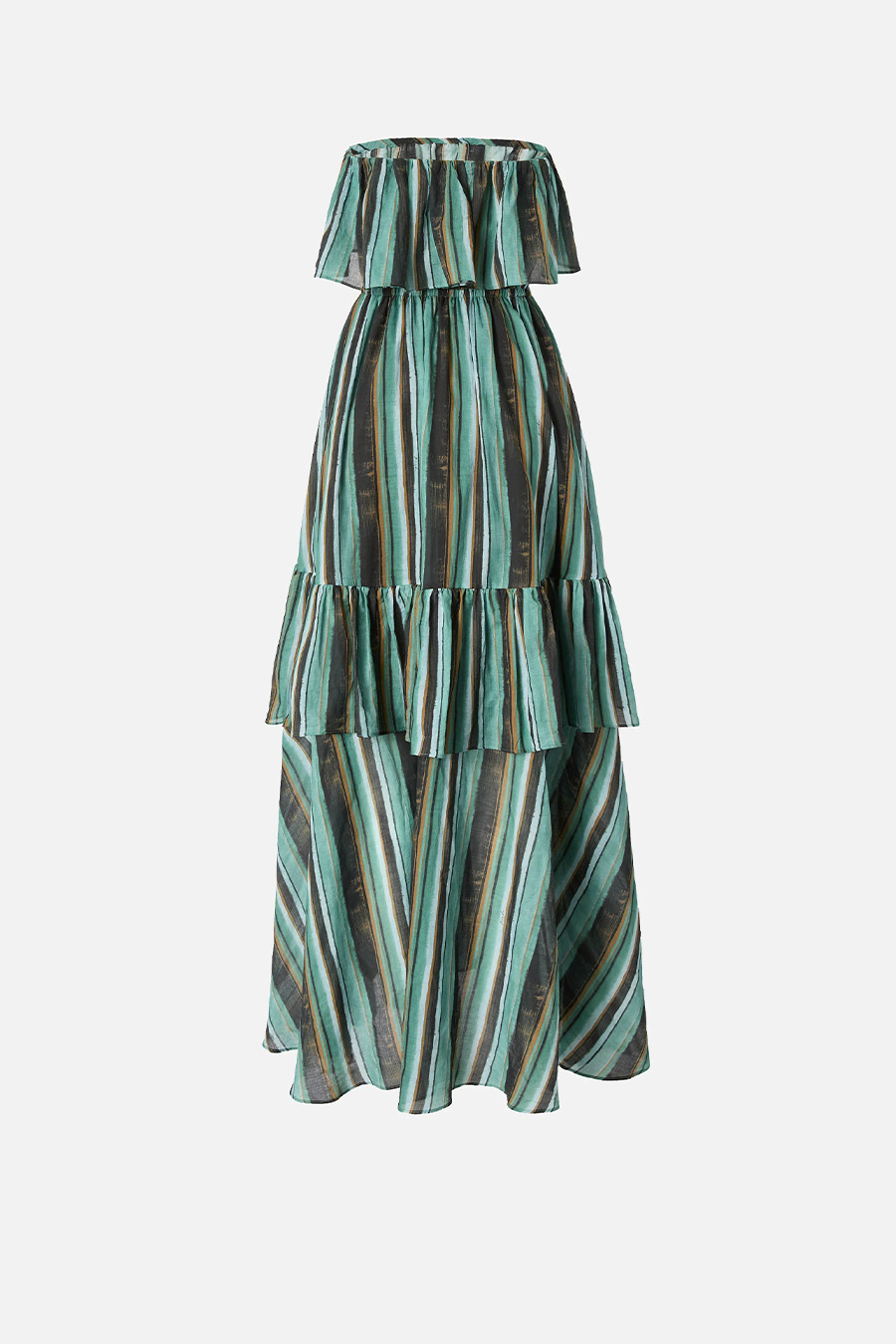 Long muslin dress with brushstroke stripe print by Pinko, featuring a Bardot neckline with maxi ruffles and a flounced construction that adds movement and volume to the entire garment.