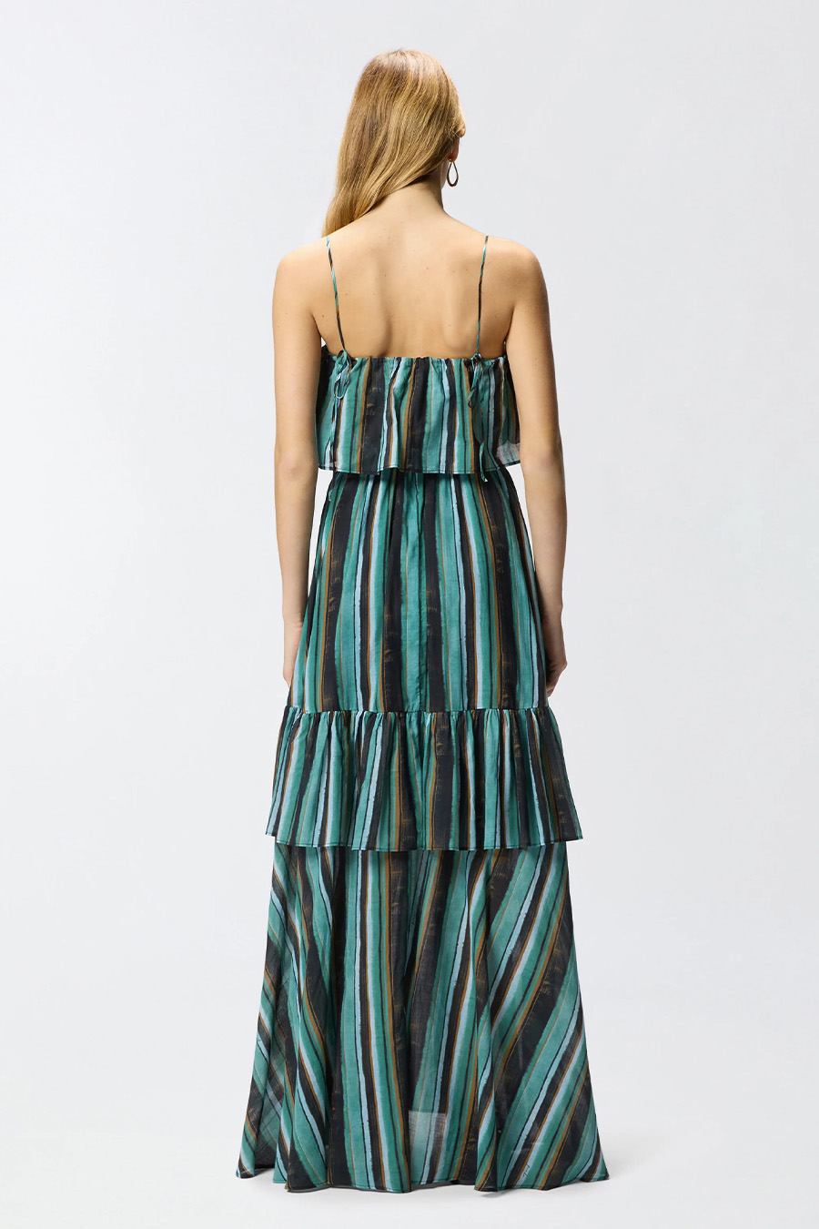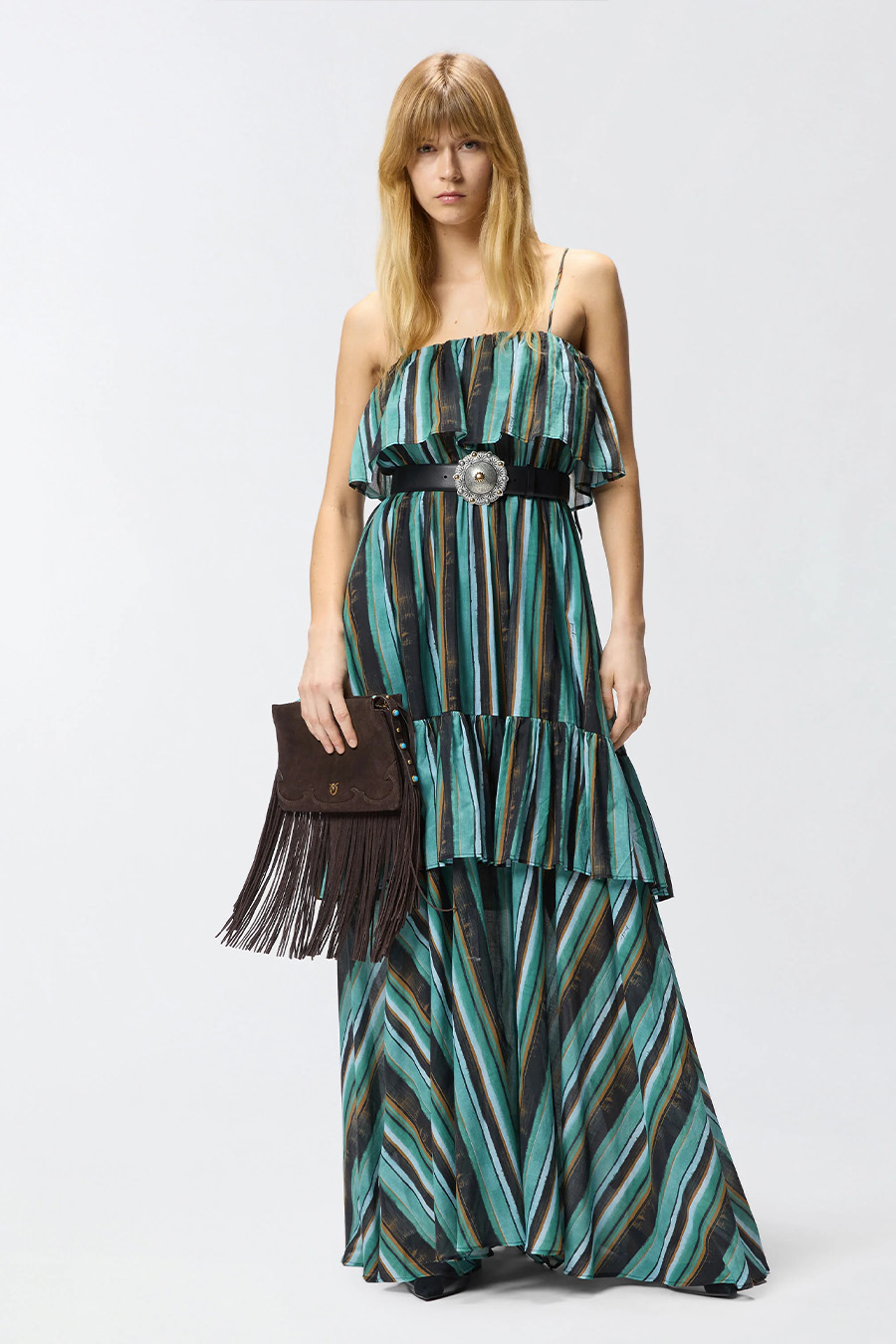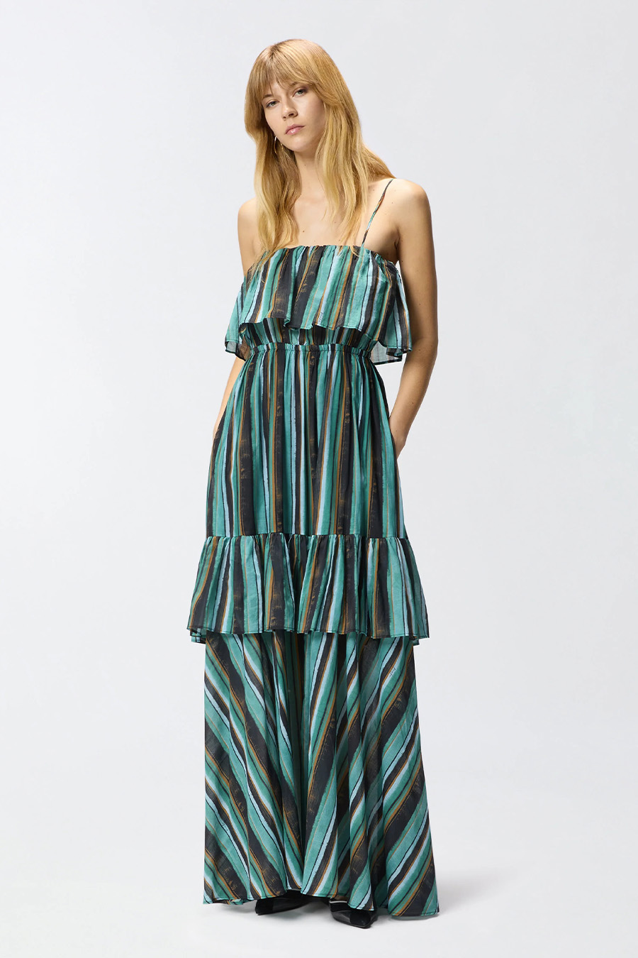 Long muslin dress with brushstroke stripe print by Pinko, featuring a Bardot neckline with maxi ruffles and a flounced construction that adds movement and volume to the entire garment.