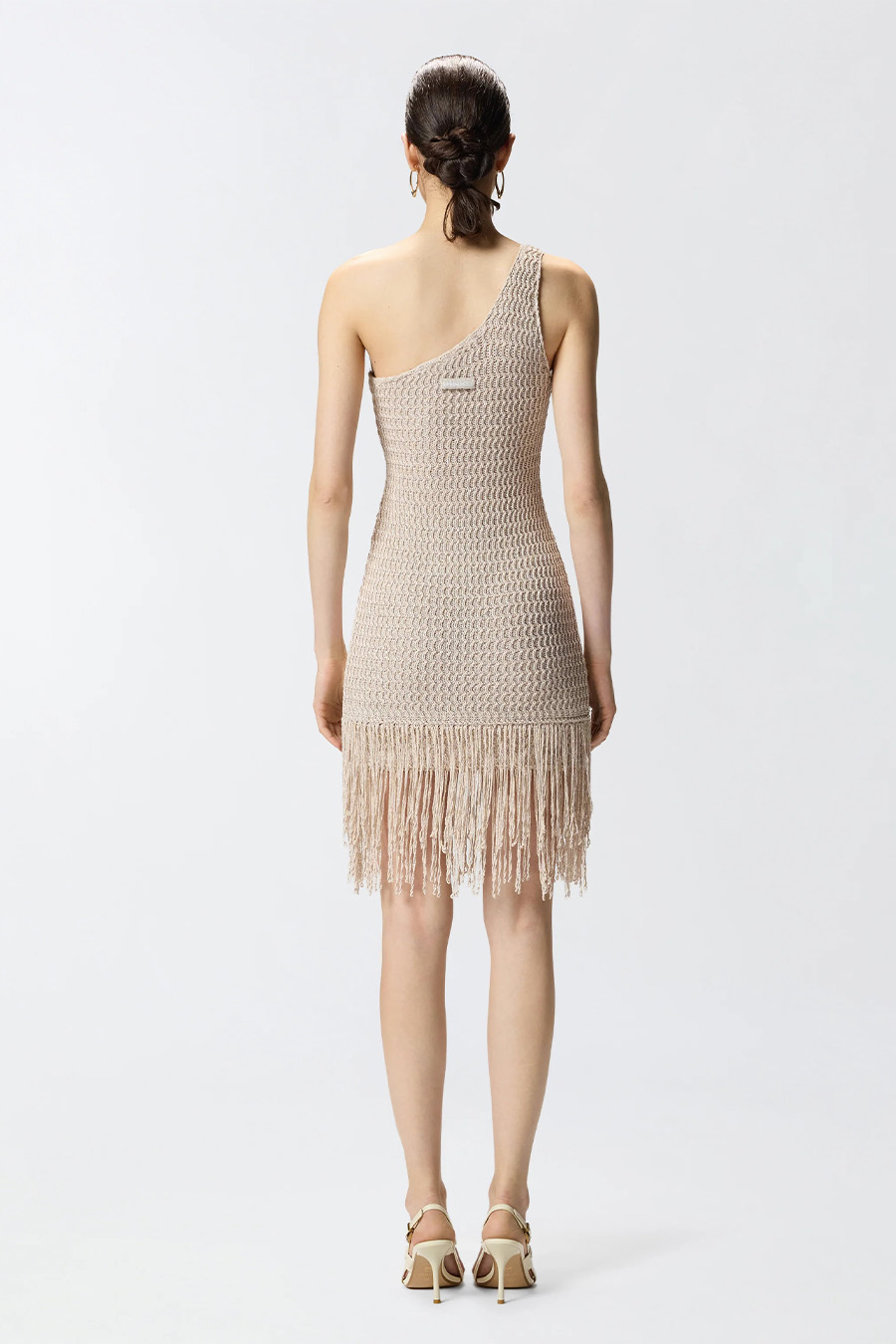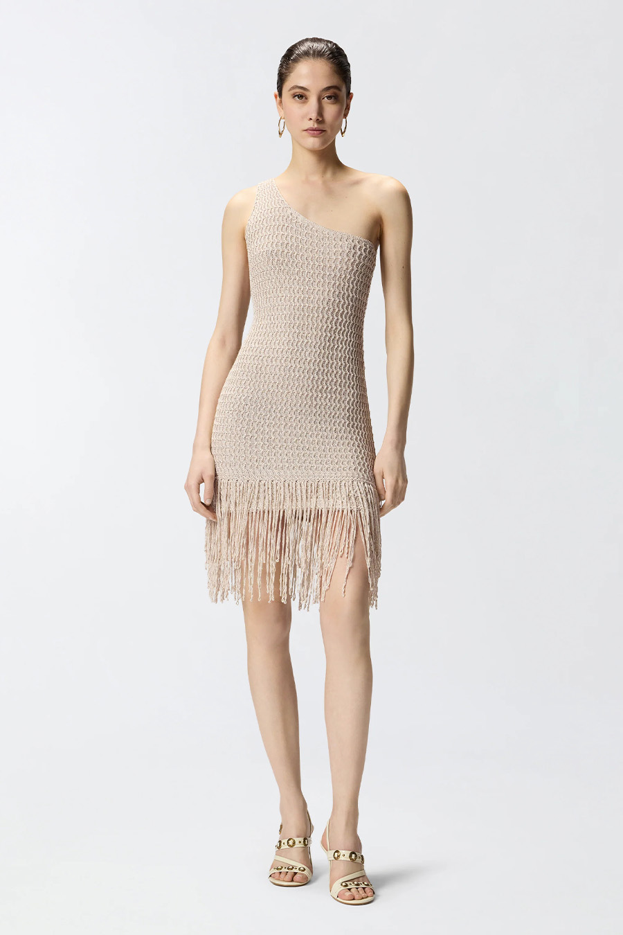A short, figure-hugging dress by Pinko, crafted from a unique viscose yarn with metallic fibres for a subtle shimmer. It features an openwork weave and a wavy texture that flatters the figure, with a sleeveless, one-shoulder design and long fringes at the hem.