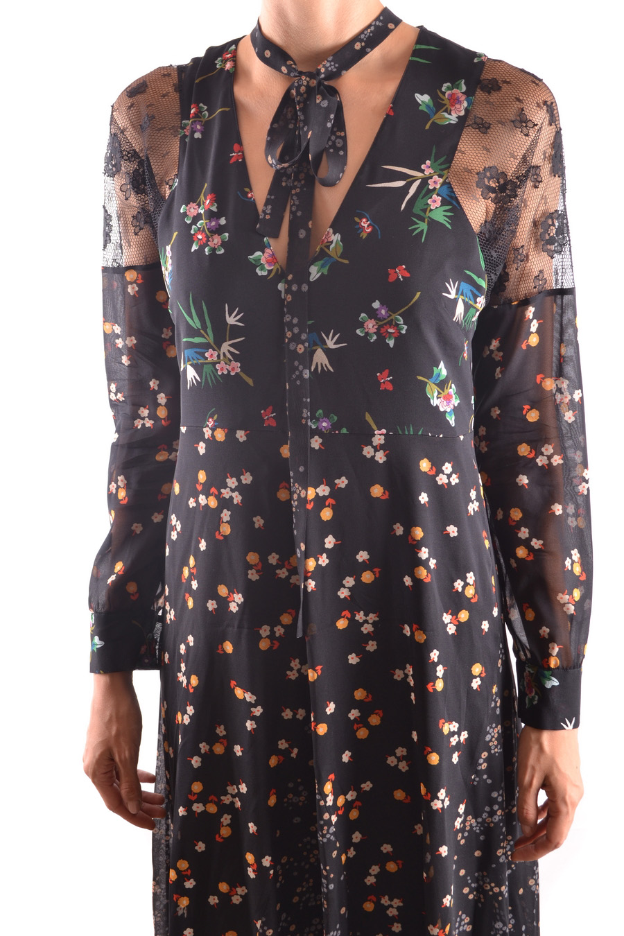 long printed dress with a bow on the neckline laces and printed silk sleeves