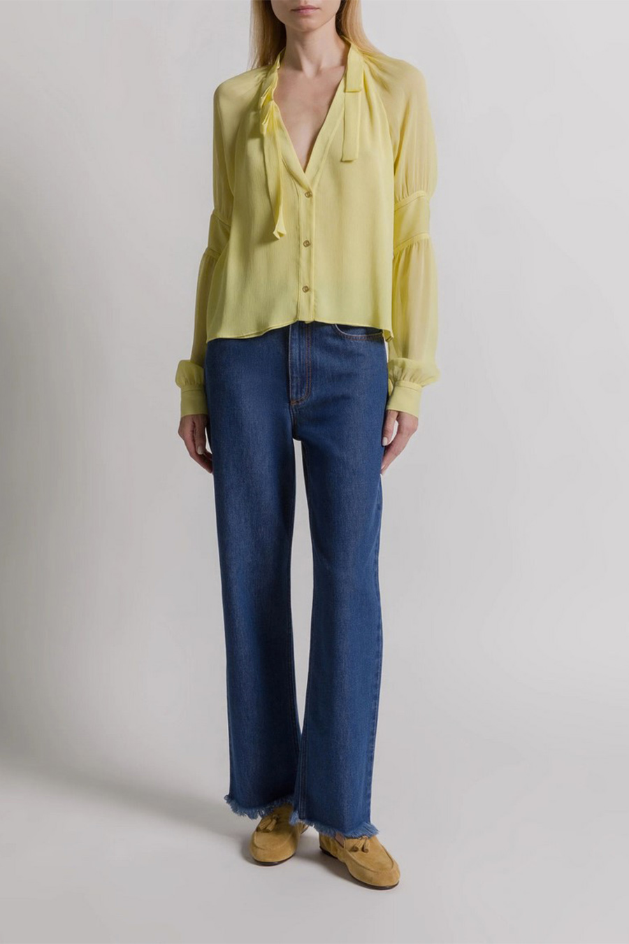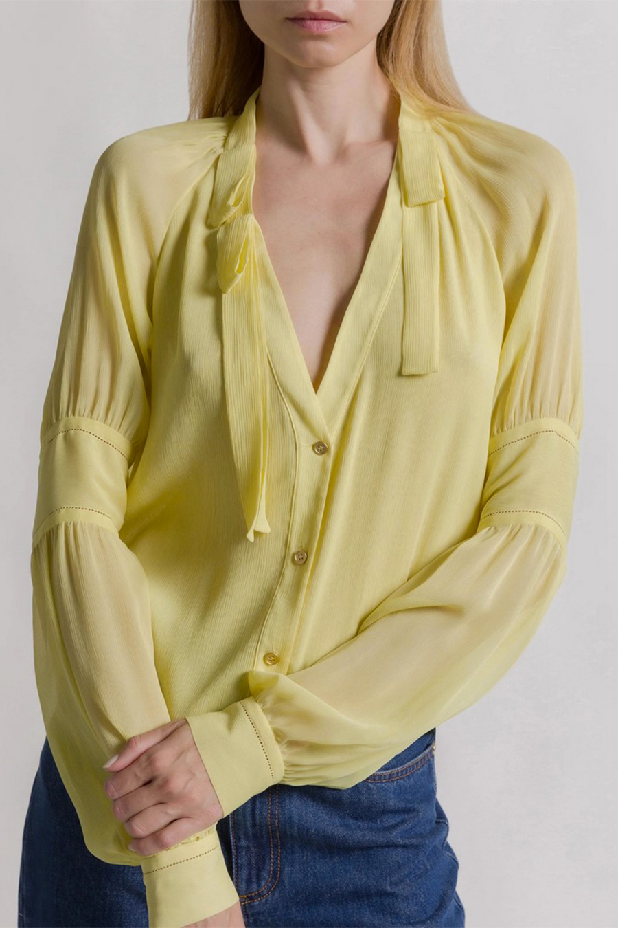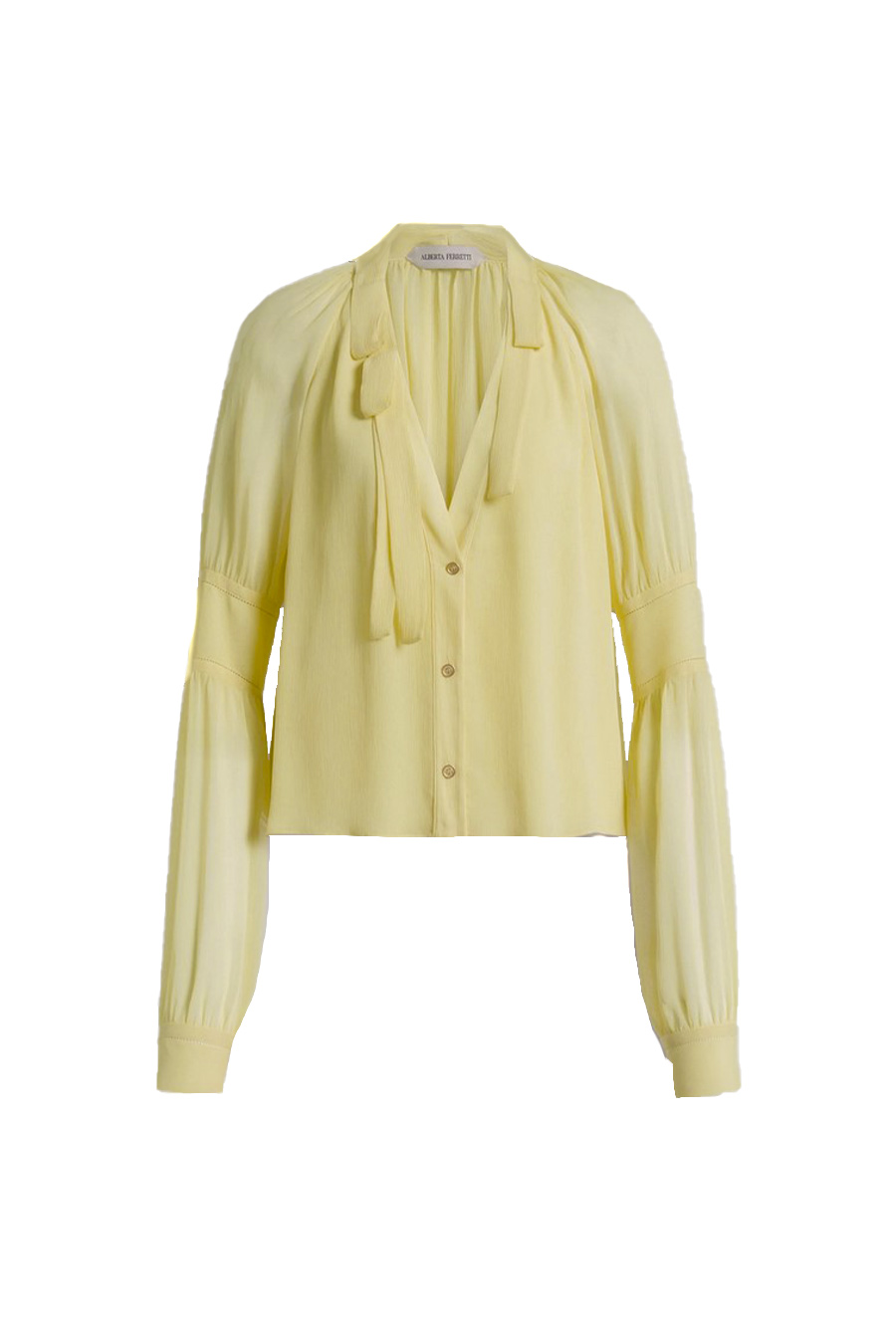 Alberta Ferretti blouse with creponne silk bow, V-neck, long sleeves, gathered cuffs.