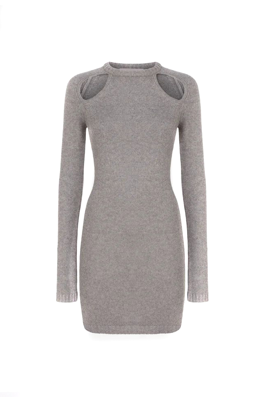 wool blend sweater dress from Chiara Ferragni featuring round neck, shoulder cuts out, long sleeves, gold lamé knitted, straight hem