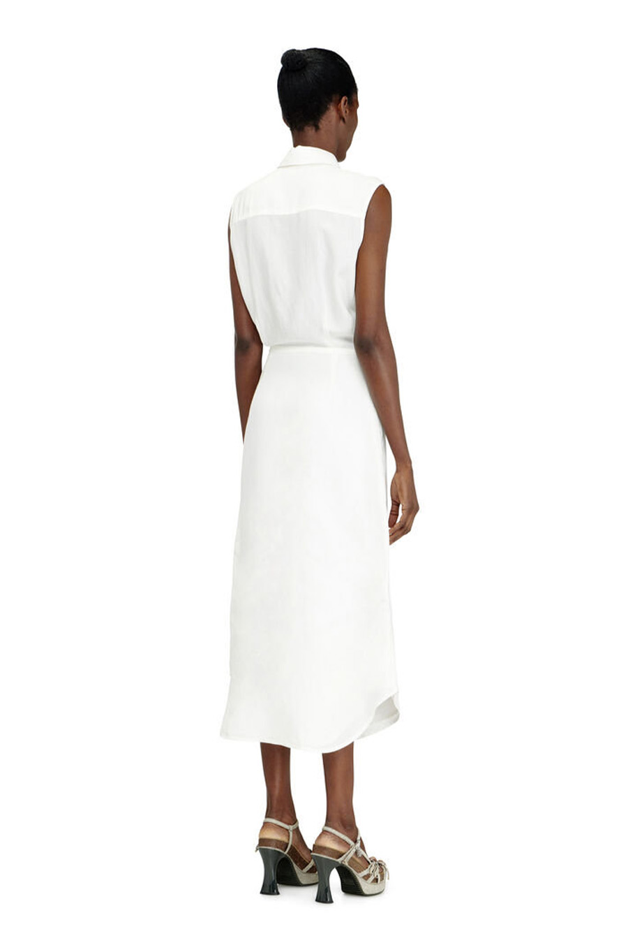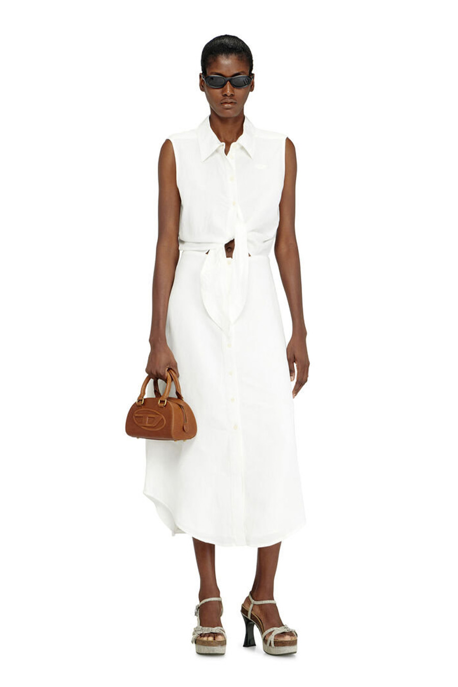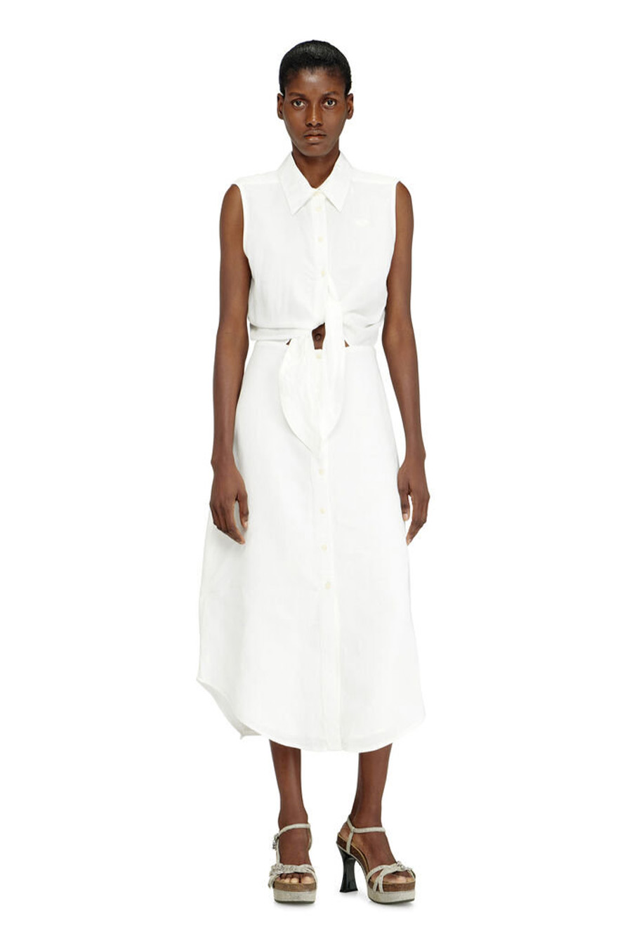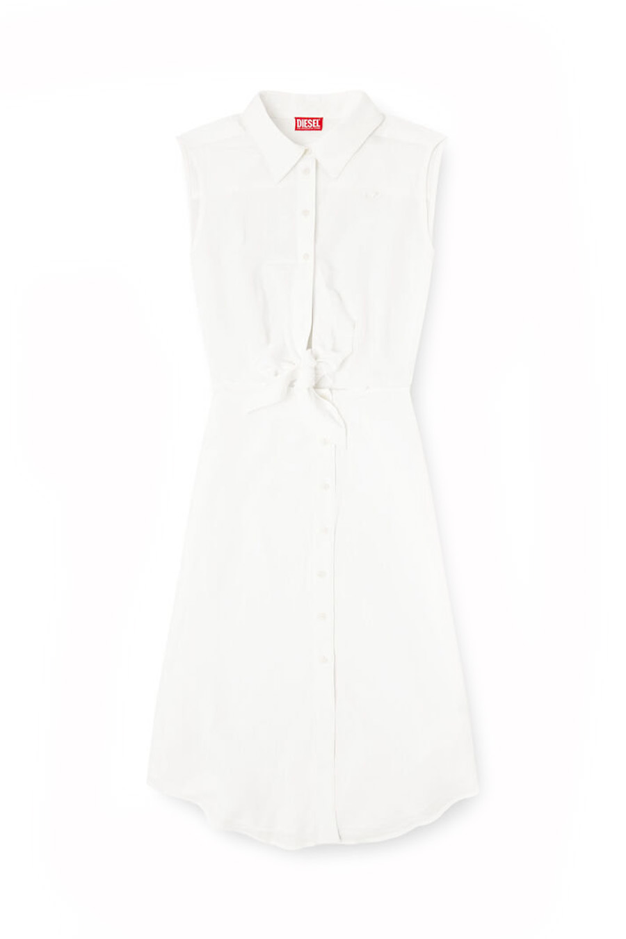 The DIESEL shirt dress features a sleeveless shirt-style top that ties at the waist and is paired with a flowing mid-length skirt.