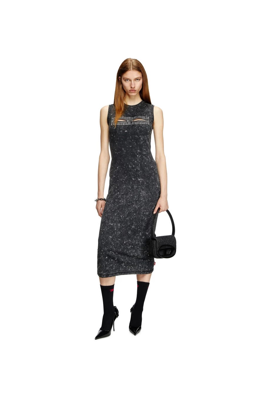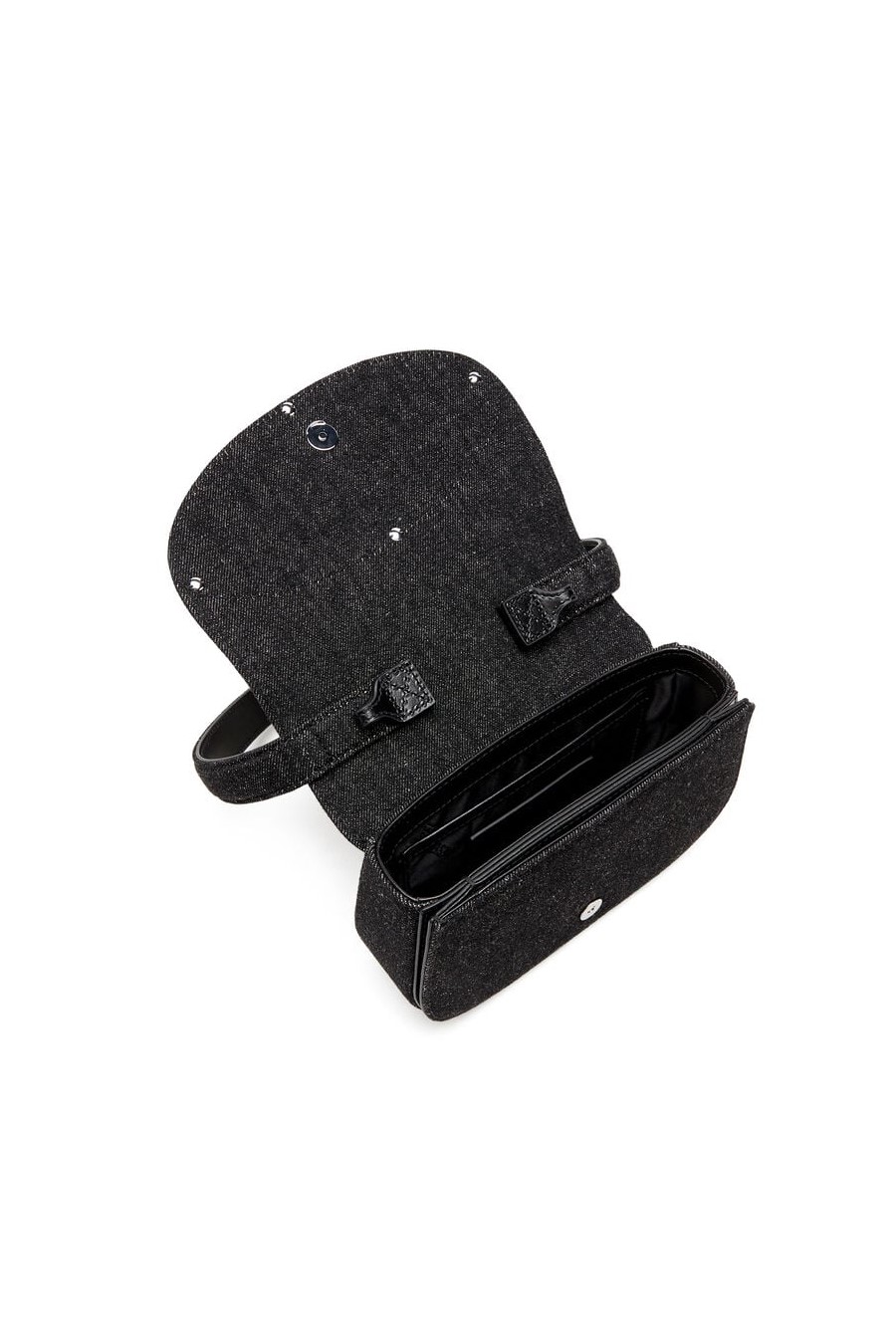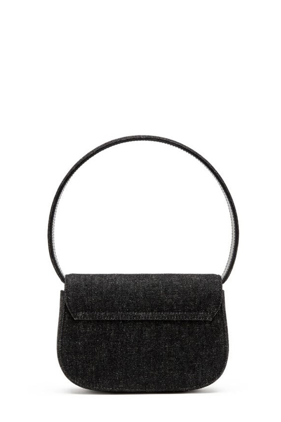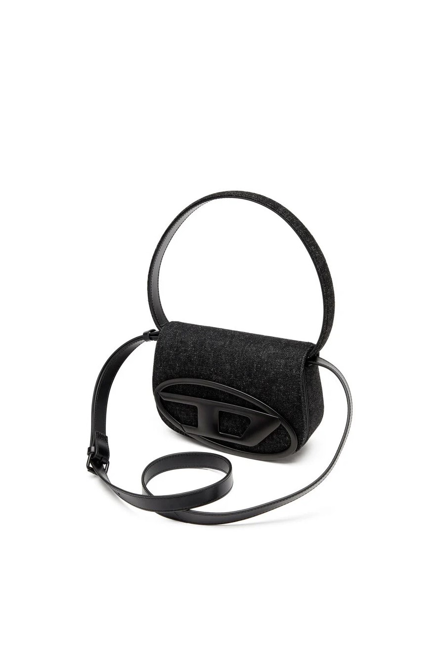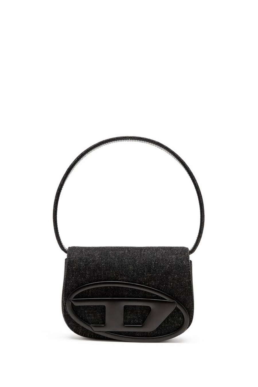 1dr Diesel made from washed black denim, Diesel's iconic fabric, with tone-on-tone leather details, featuring a handle for carrying under the shoulder and a longer shoulder strap, the flap is decorated with the Oval D plaque.