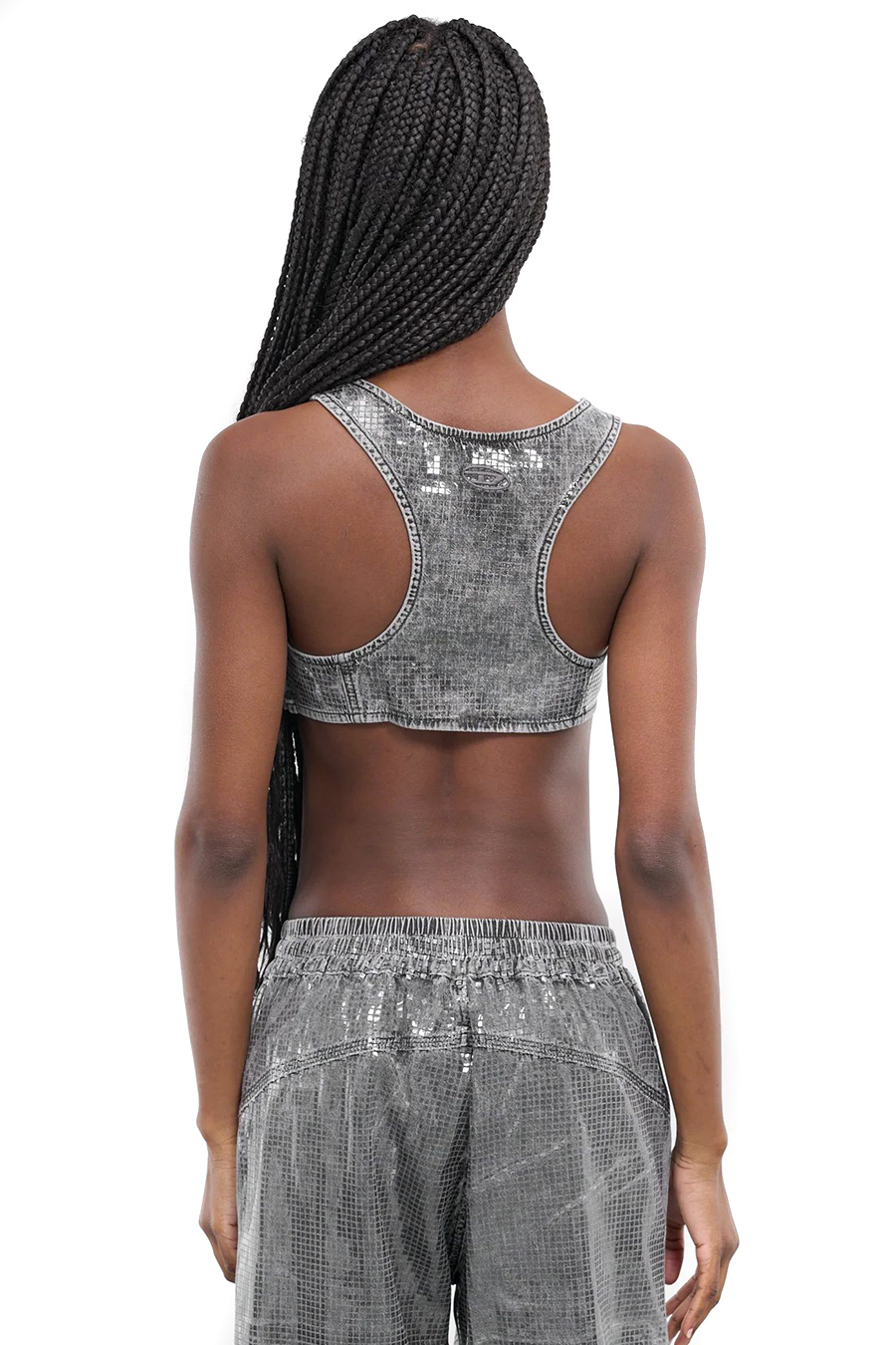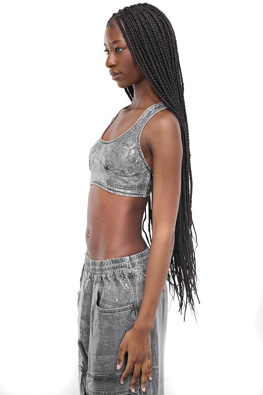 DIESEL short top in grey denim . Characterised by the application of mini sequins all over the top to give it a shiny effect. side zip