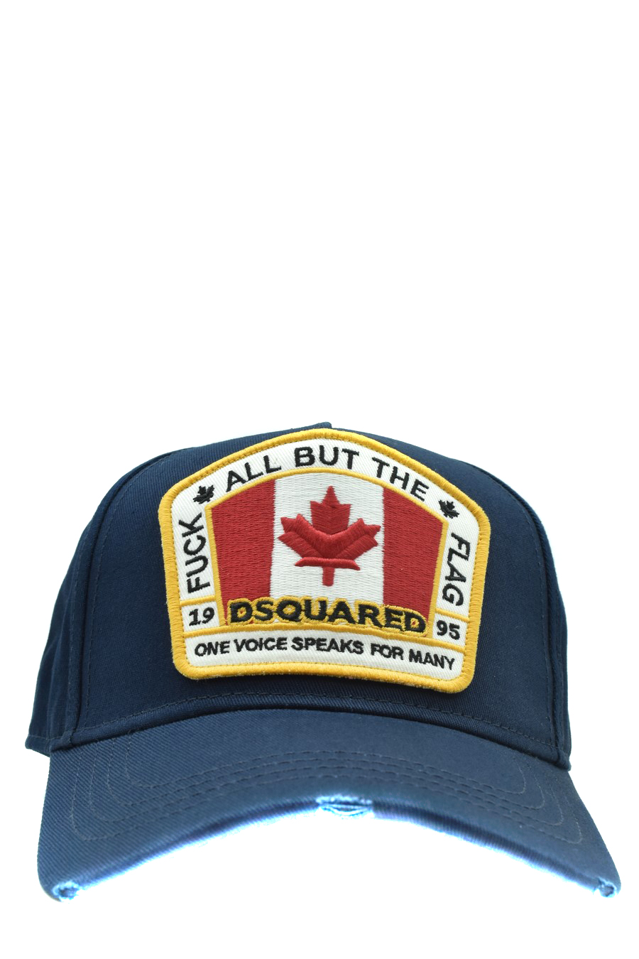 navy blue cotton baseball hat from Dsquared2 featuring Canadian flag patch on the front, curved peak, adjustable fit, distressed finish, embroidered detail to the rear.