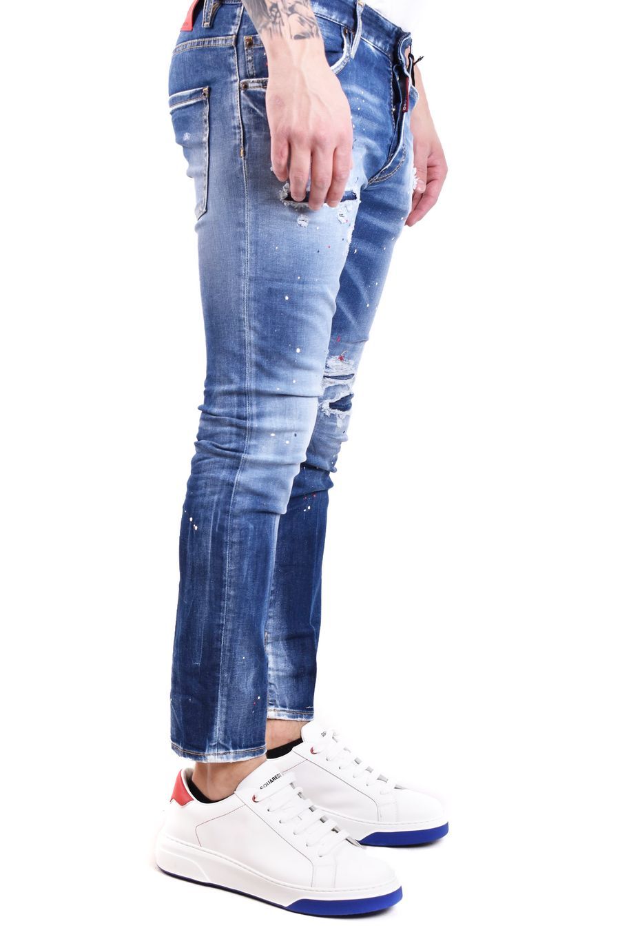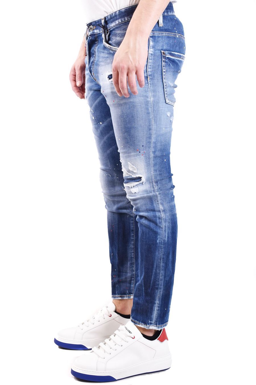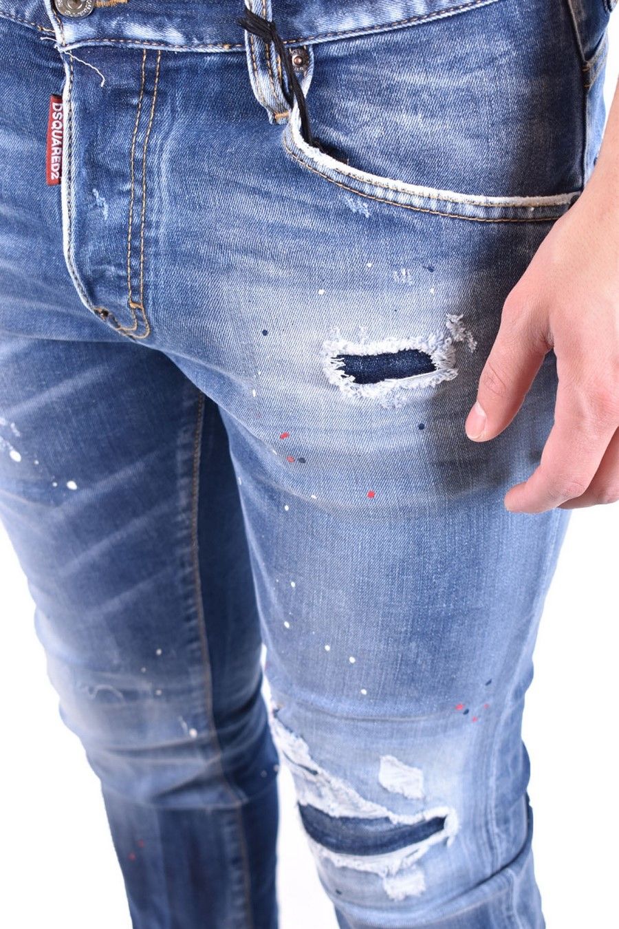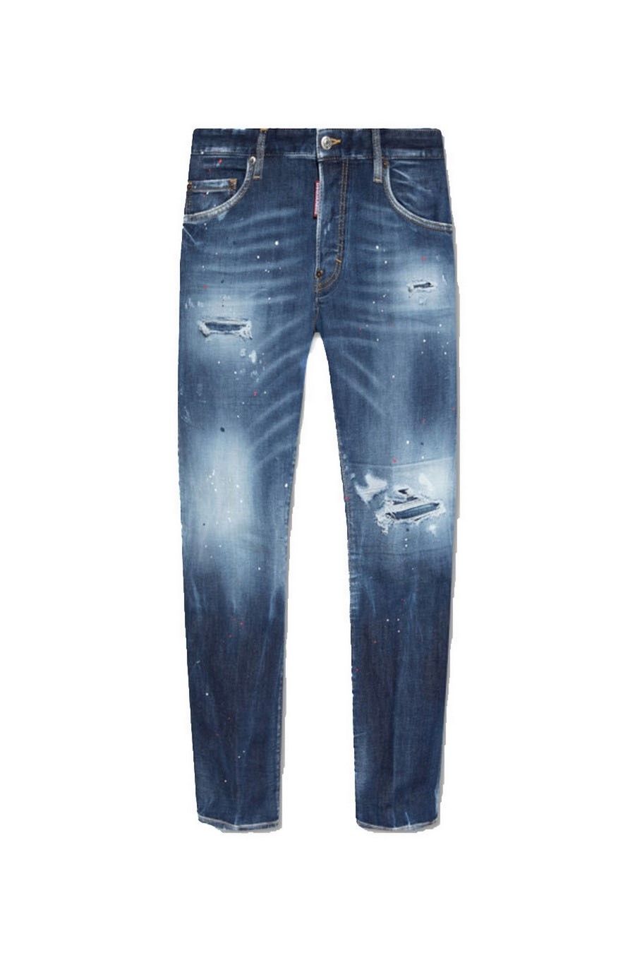 dark blue jeans from Dsquared2 featuring stretch-cotton, front button fastening, classic five pockets, belt loops, tapered leg, paint splatter detai, stonewashed