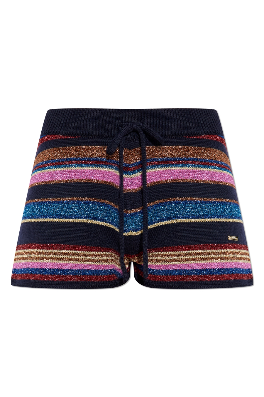 Dsquared2 MULTICOLOR shorts with lurex thread, the simple and slightly fitted cut gently accentuates the silhouette, while the high waist with adjustable drawstring allows for a perfect fit, with a horizontal striped pattern in saturated metallic shades, ranging from intense navy blue, through golden and carmine accents, to radiant shades of blue. The pronounced knit texture and use of Lurex yarn add extraordinary shine, creating an aura of luxury and originality.