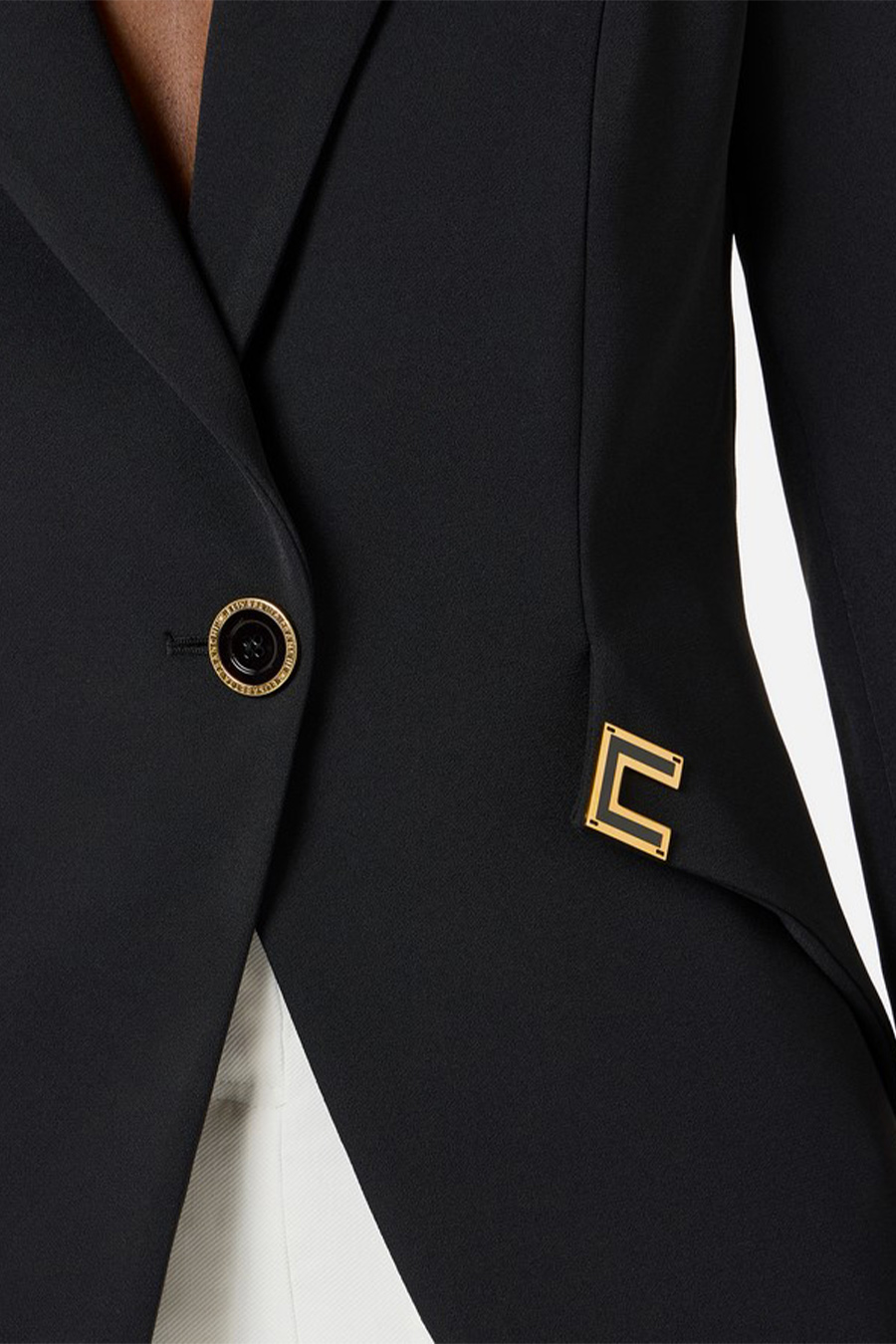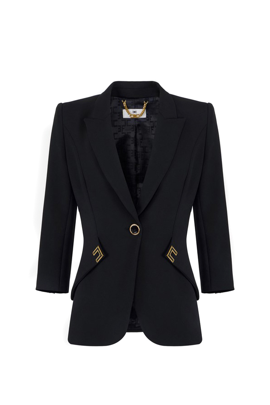 Elisabetta Franchi double stretch crepe jacket with structured shoulders, peak lapels and three-quarter sleeves, diagonal cuts on the hips, embellished with gold metal logo details and enamelled on the inside.