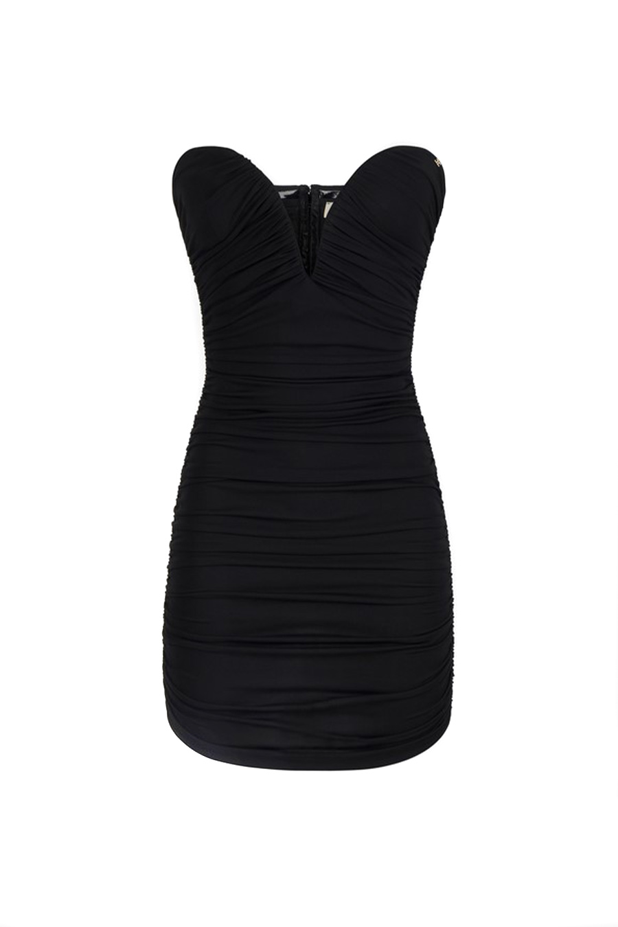 Elisabetta Franchi mini dress in crêpe jersey with bare shoulders and a deep sweetheart neckline, with draping that creates rhythm along the entire length.