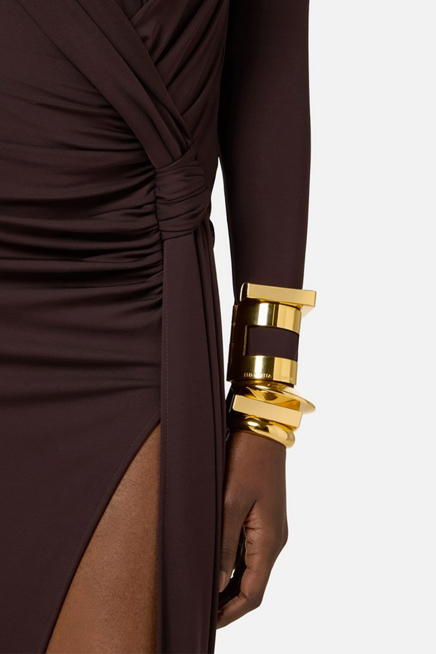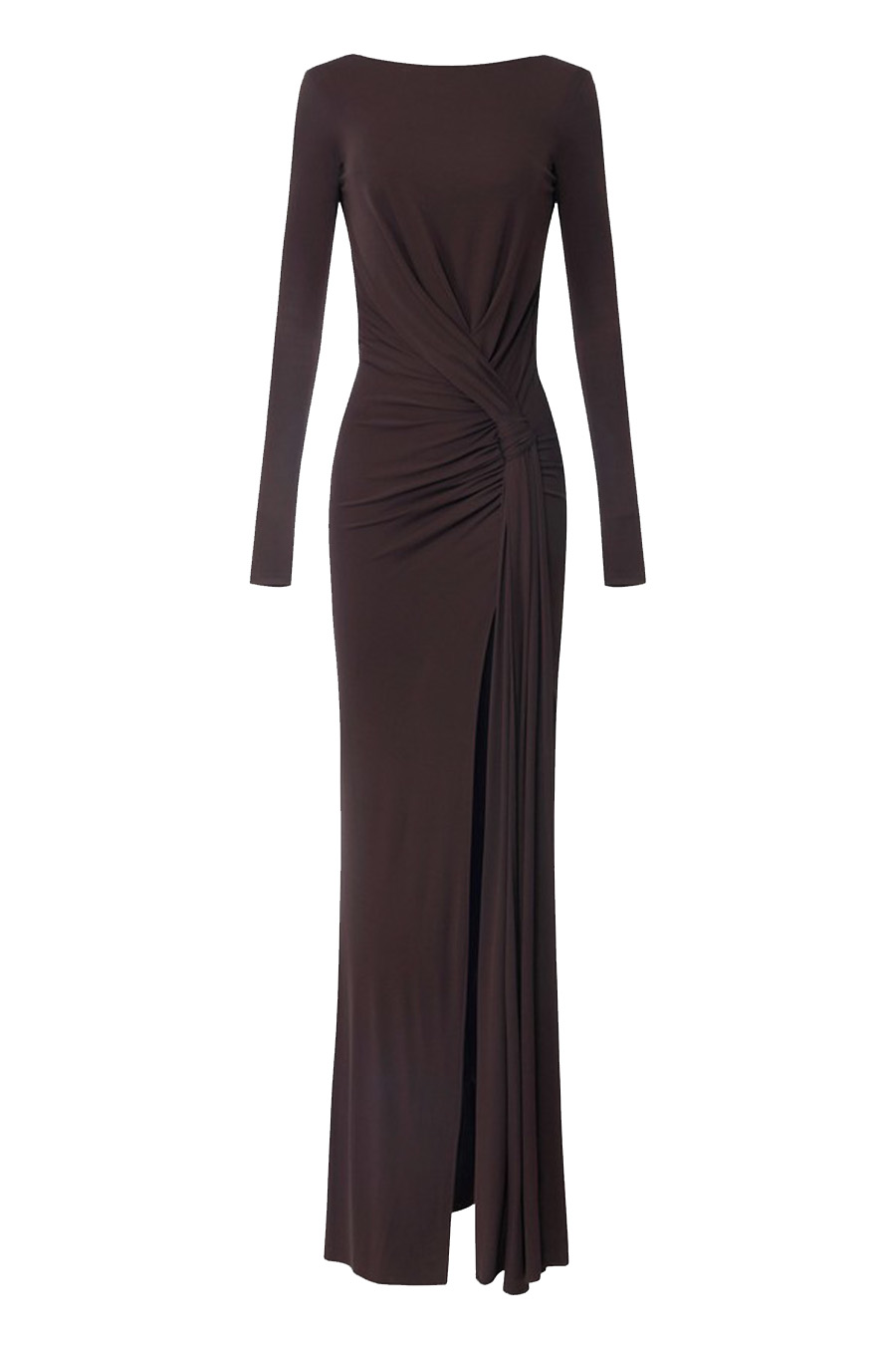 The deep side slit on the skirt creates a slender silhouette.