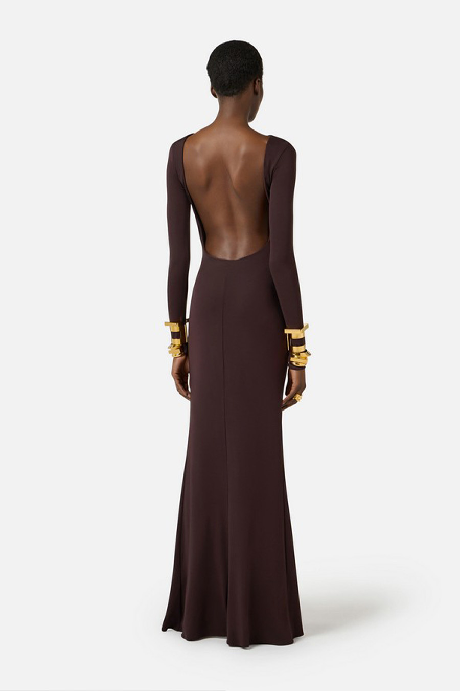 Elisabetta Franchi red carpet dress in crêpe jersey, featuring a fitted cut, a boat neckline and an open back.