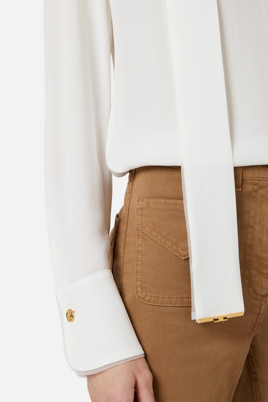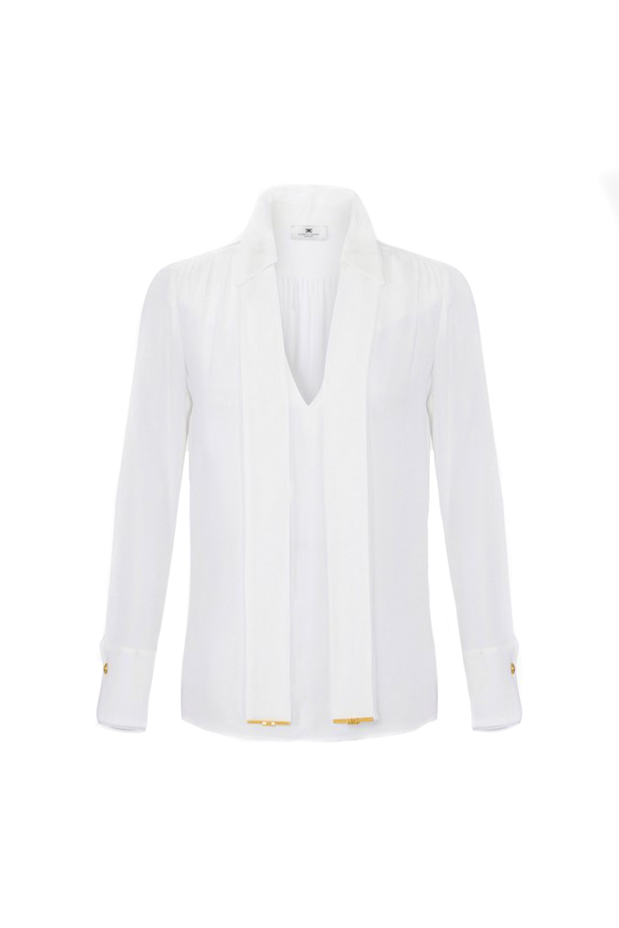 Elisabetta Franchi viscose georgette shirt with V-neck and long sleeves, featuring a sash that frames the neckline, embellished with gold metal plates at the ends.
