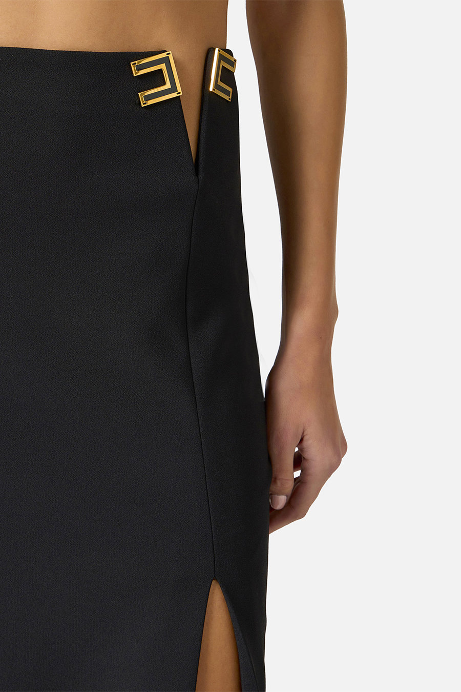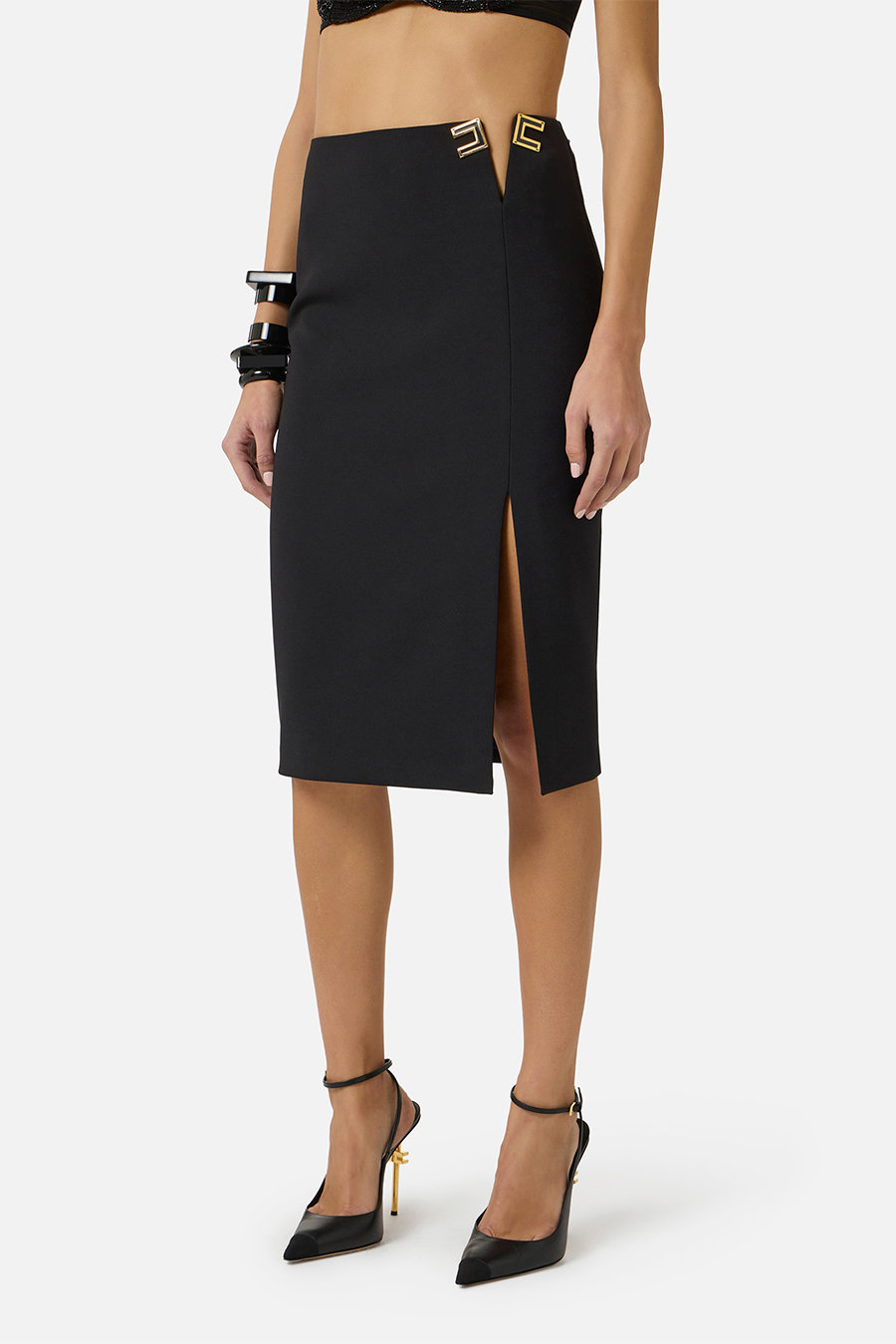 Elisabetta Franchi midi skirt in double stretch crêpe, featuring a V-shaped opening at the waist on one side, which opens into a side slit.