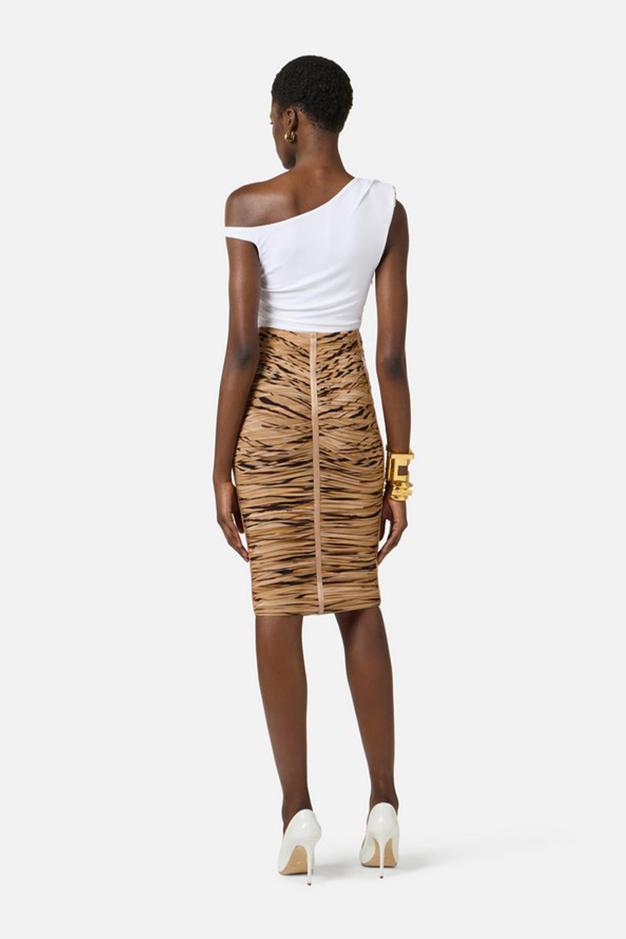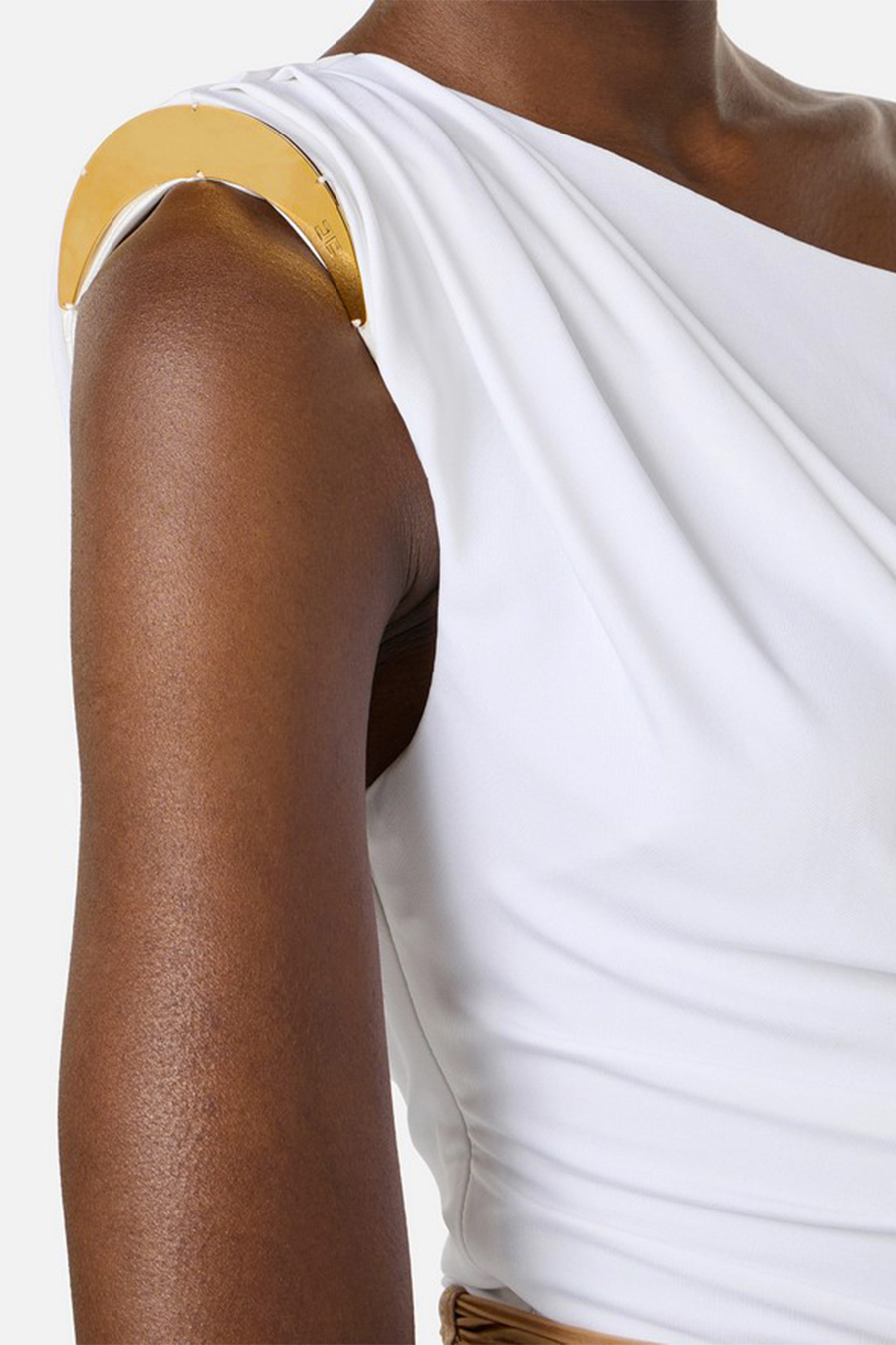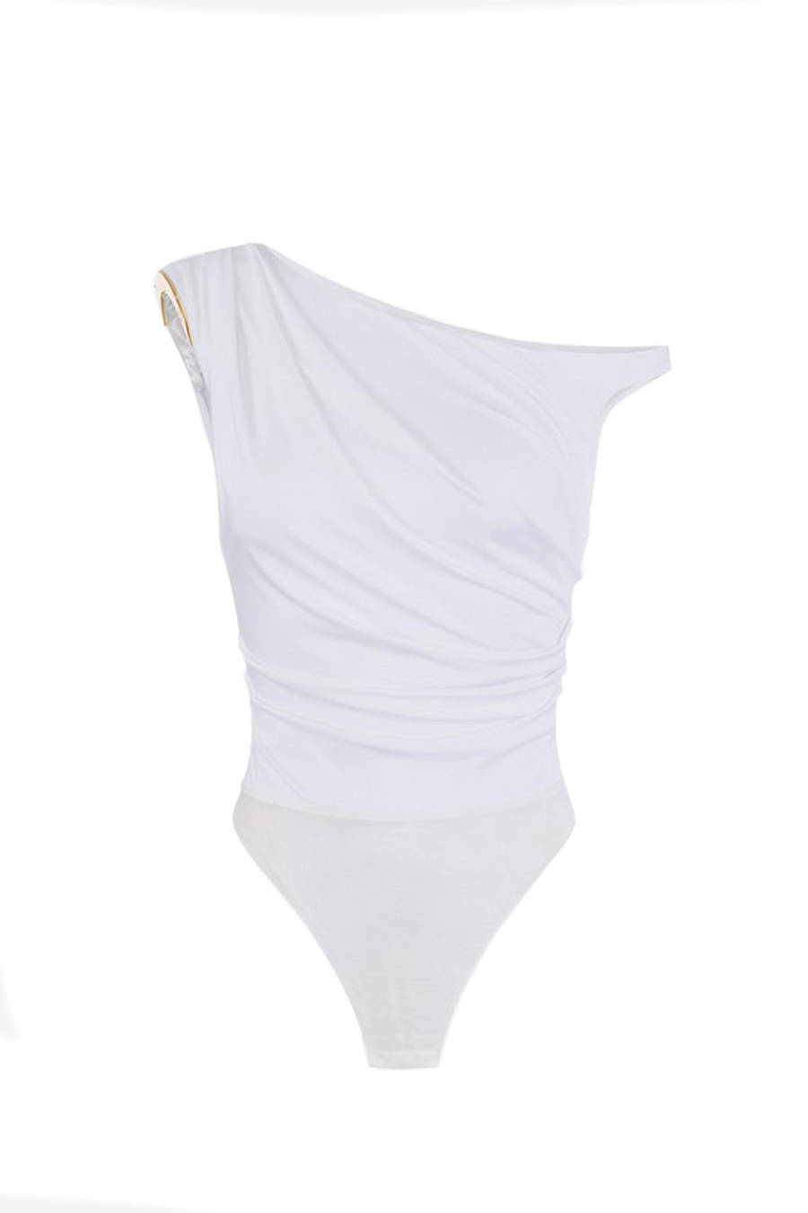 Jersey bodysuit with jewelled shoulder by Elisabetta Franchi, featuring a structured one-shoulder design and fastened with a golden metal crescent for a touch of sparkle.