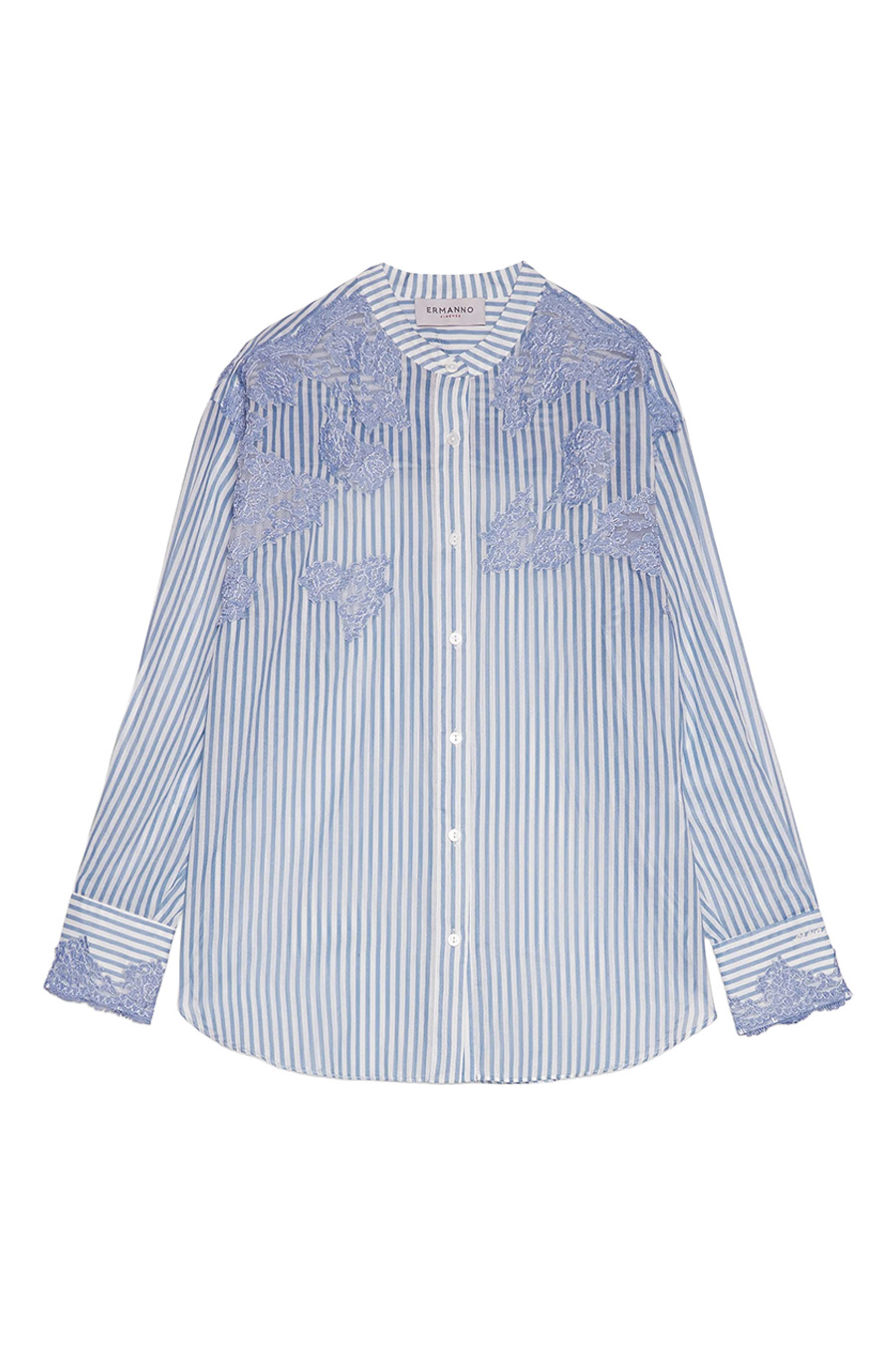 Denim-print striped shirt with embroidered lace by Ermanno Firenze, designed by Ermanno Scervino, crafted from lightweight cotton muslin with a denim-effect printed stripe pattern and sheer light blue embroidered lace on the shoulders and front.