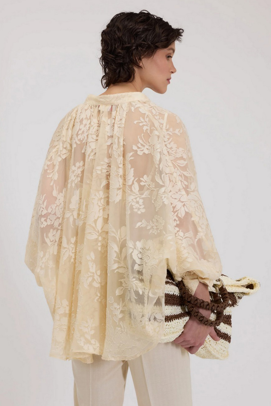 The blouse has a loose, cape-like silhouette with gathering at the top, a mandarin collar and buttoned cuffs.