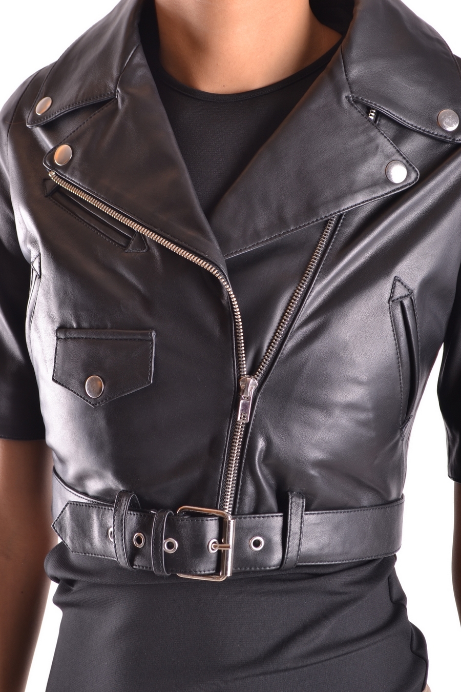 short and slim fit leather jacket with zipped sleeves and detachable belt