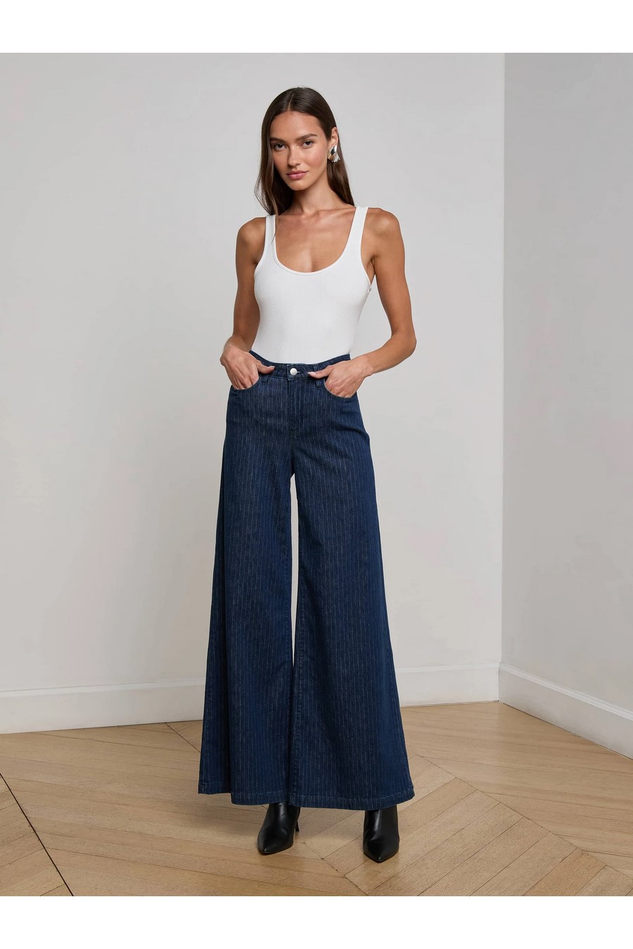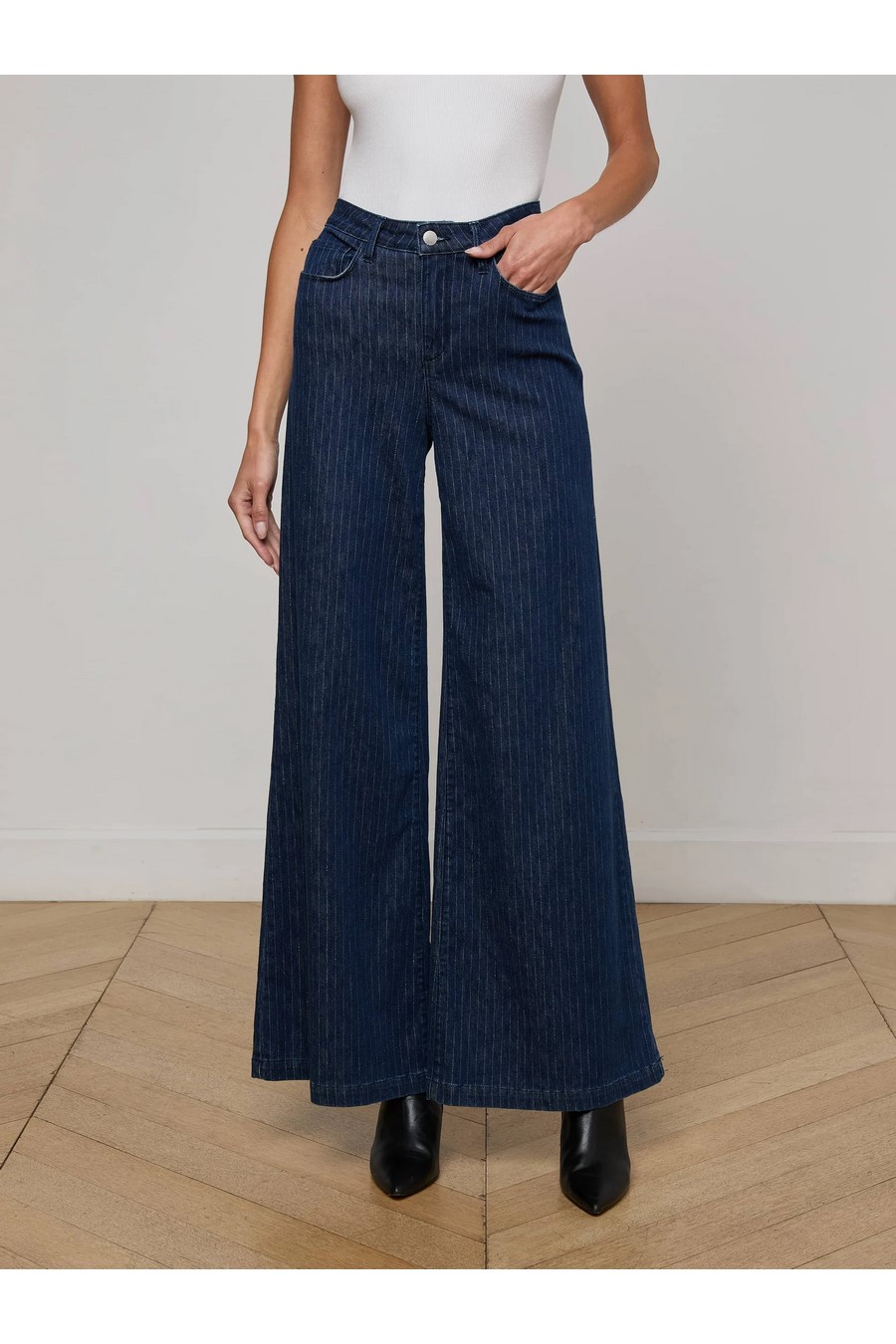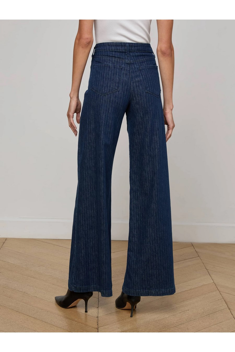 Quincy Pinstriped Jean L'Agence, superelastisch, weit geschnitten, 5 Taschen, Hosenschlitz mit Knopf und Reißverschluss.
