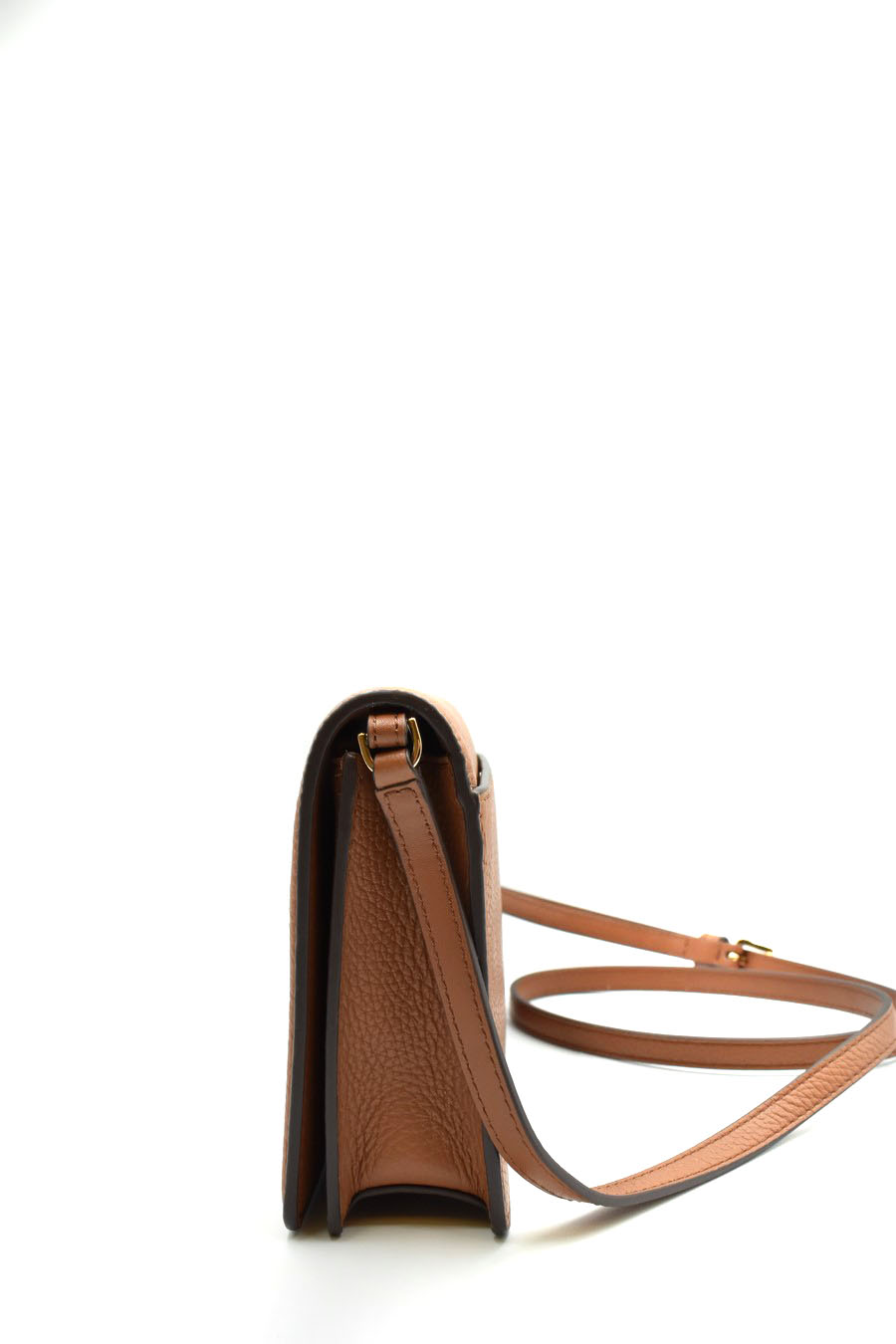 adjustable shoulder strap. Flap at the top, logo in gold lettering.