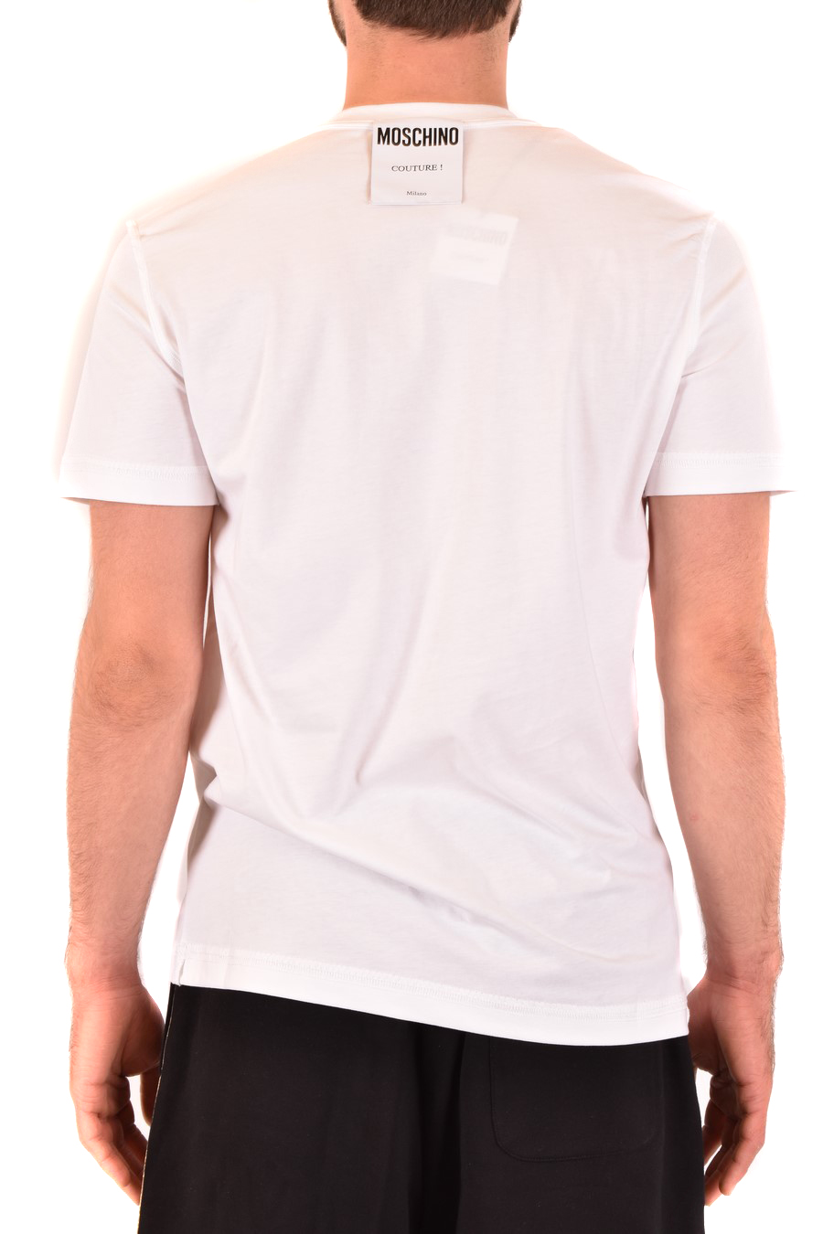 white cotton t-shirt from Moschino featuring round neck, short sleeves, inverse logo print to the chest, straight hem
