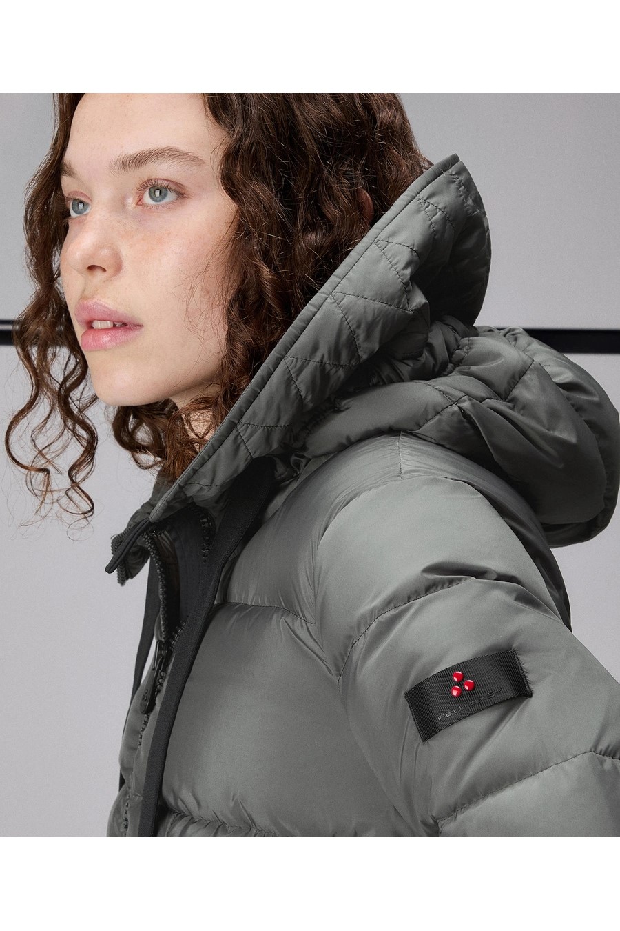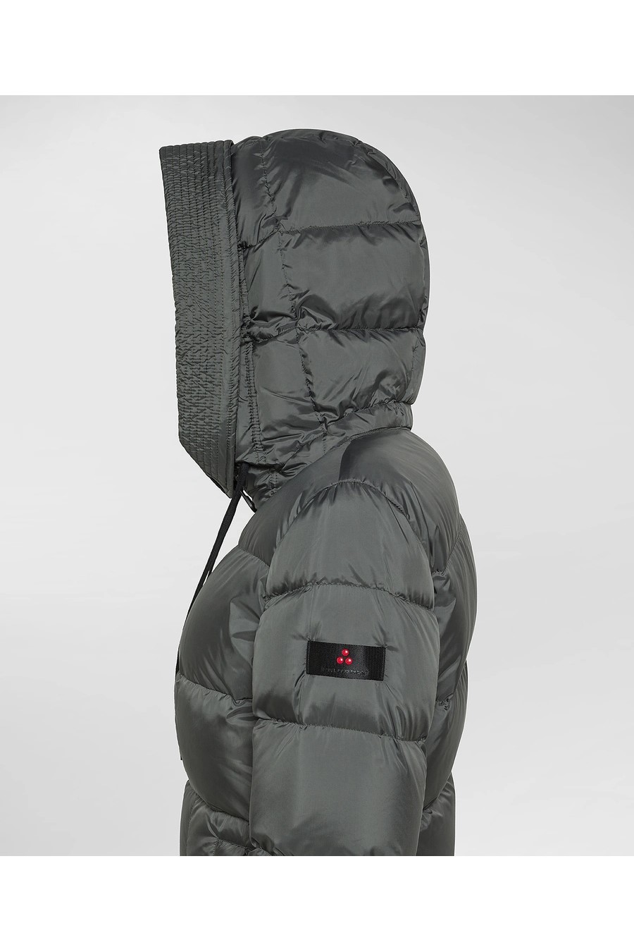Peuterey long down jacket made from super-light 100% post-consumer recycled polyester fabric, semi-matt finish and ultra-compact structure, natural down padding, high collar, fixed adjustable hood, double-slider zip fastening and large side pockets.