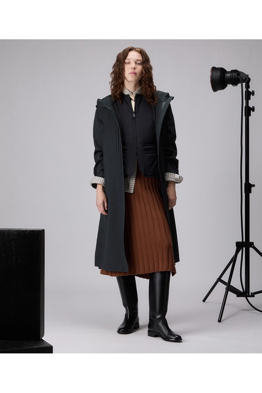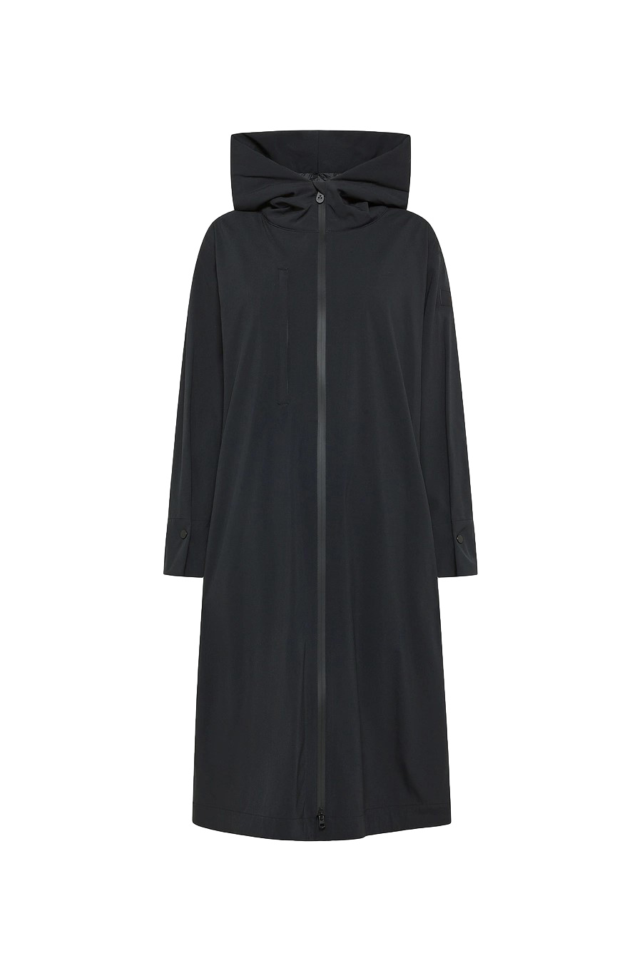 Functional details such as the large fixed hood, invisible side pockets, chest pocket and buttoned cuffs complete a garment designed for city life and outdoor days.