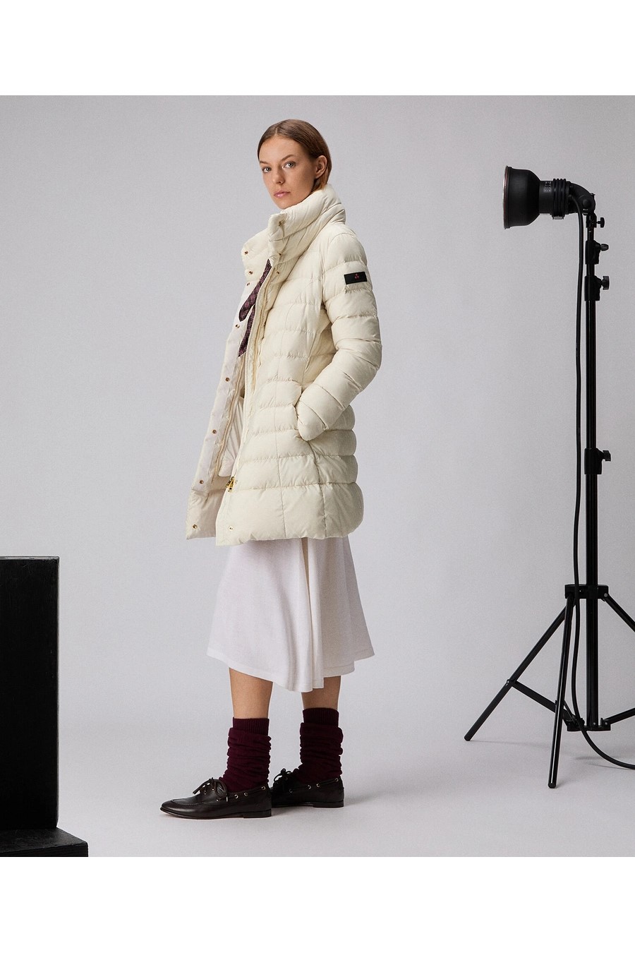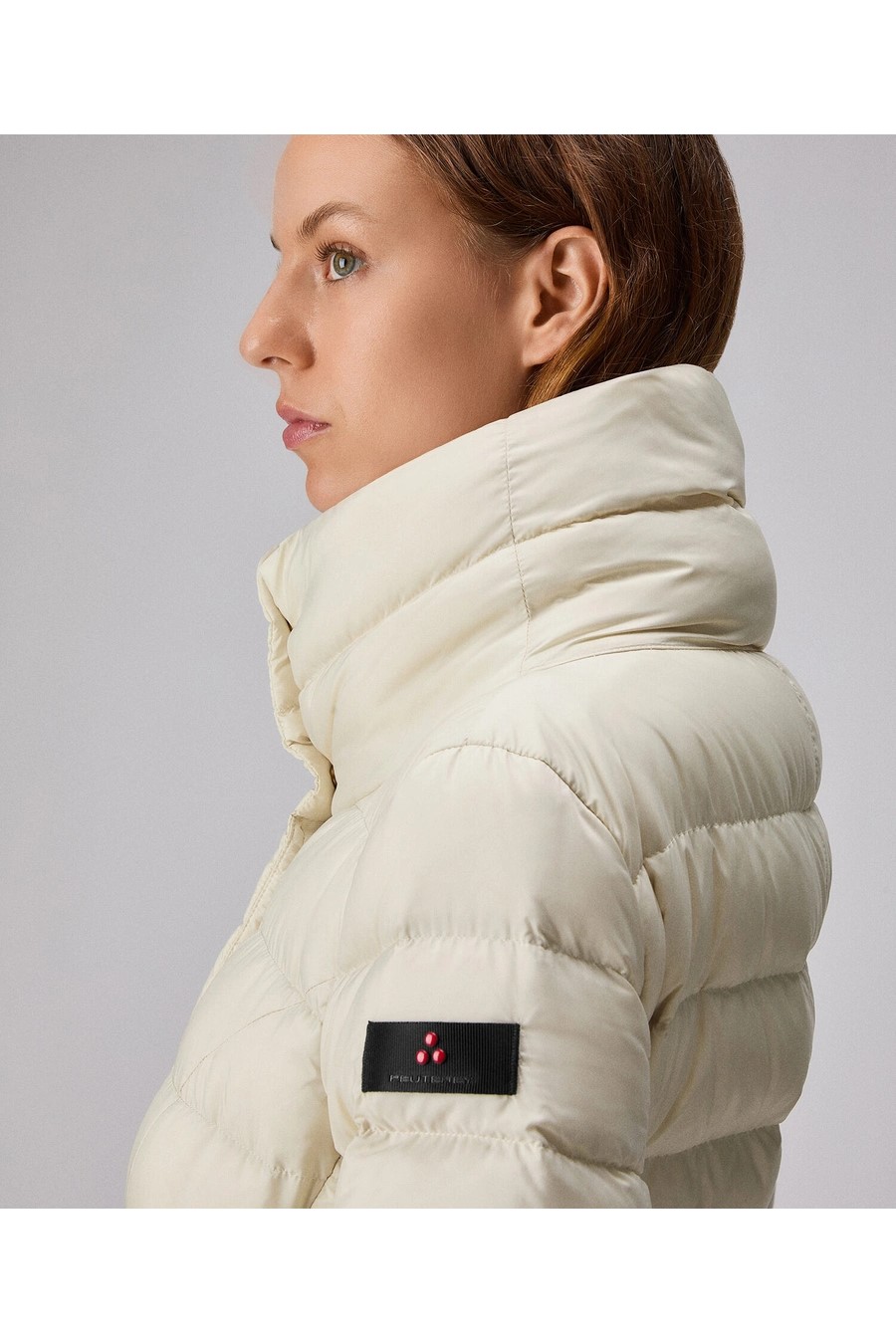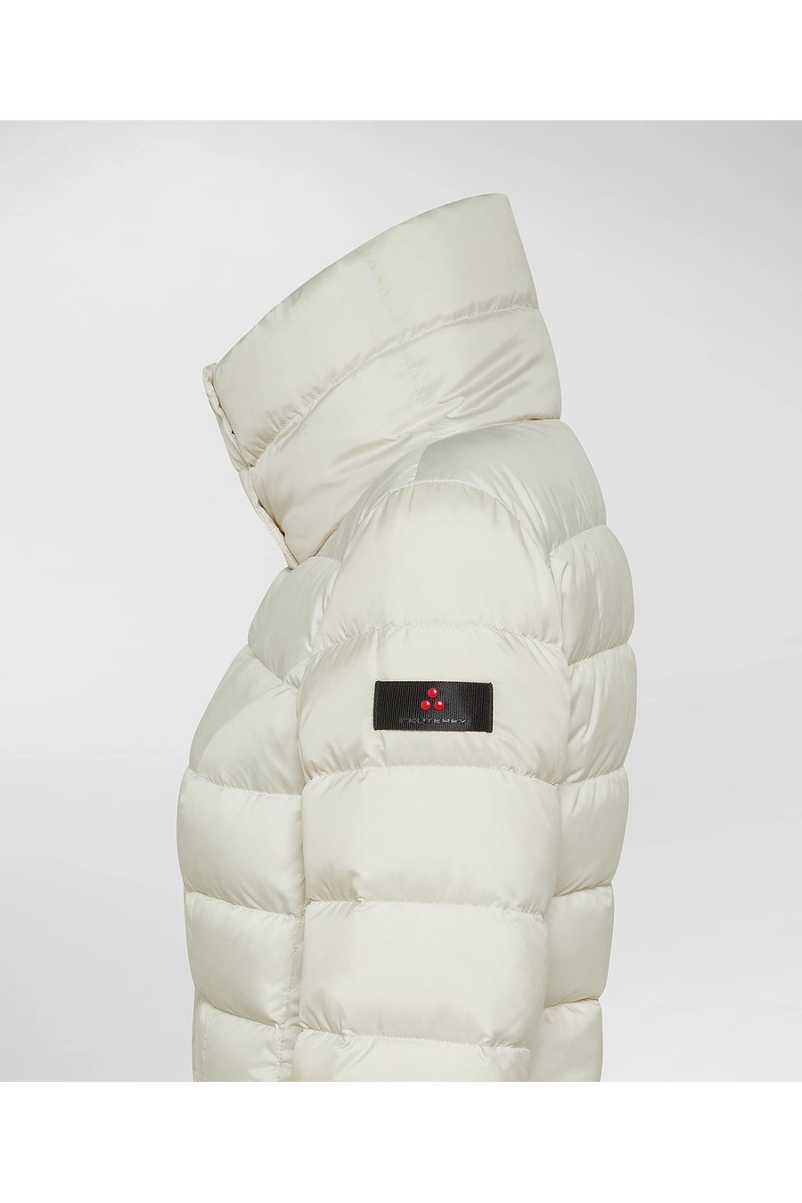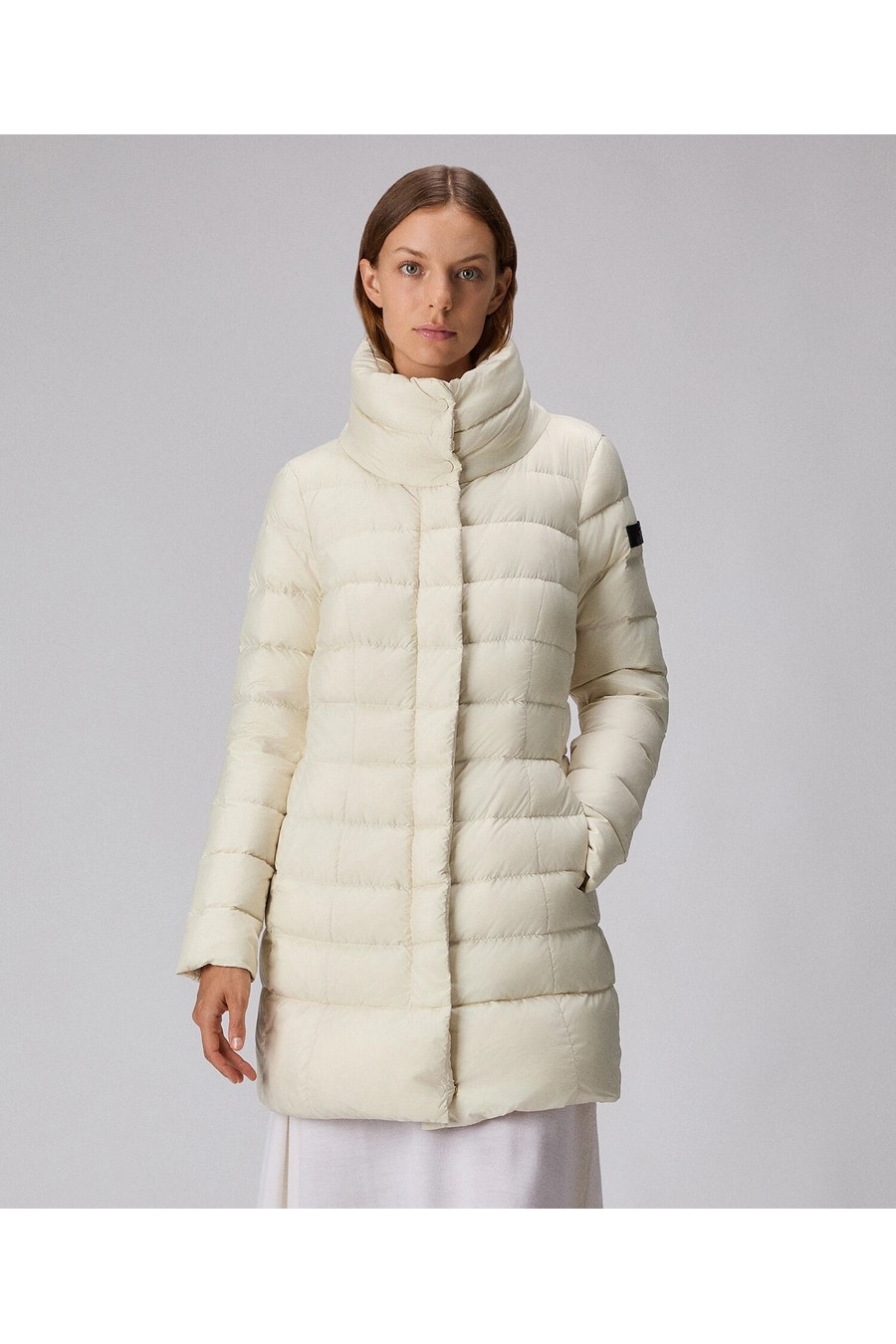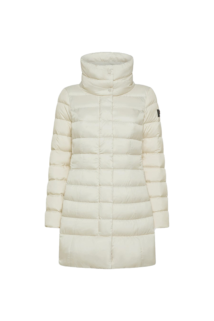 Peuterey long down jacket with high collar in super-light narrow-channel fabric, made from 100% recycled polyester, treated with PFC-free technology that guarantees water repellency without the use of harmful chemicals, certified natural down filling, front closure with double-slider zip and press studs, concealed by a flap, two large side pockets at hip height.