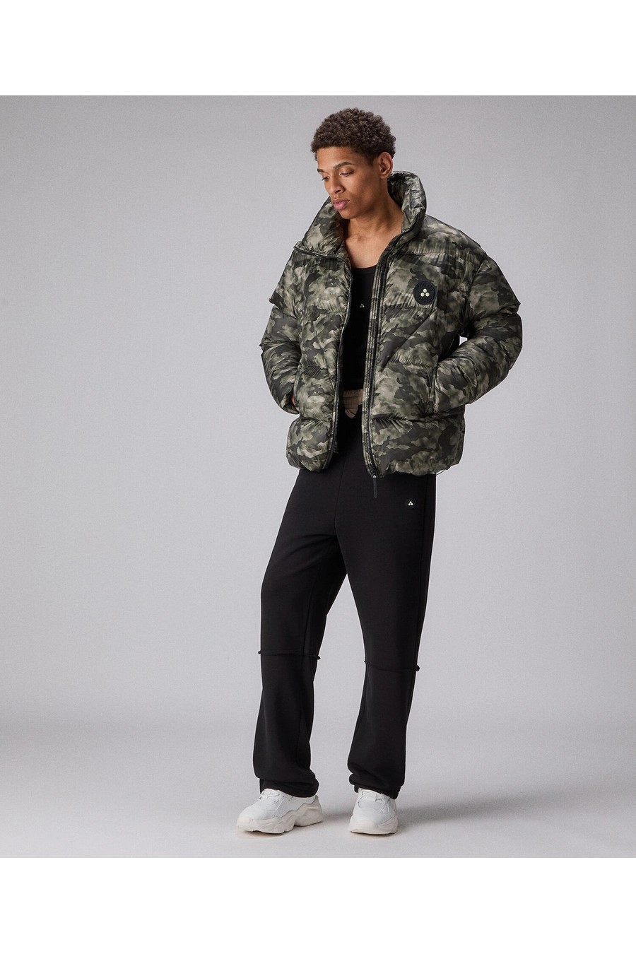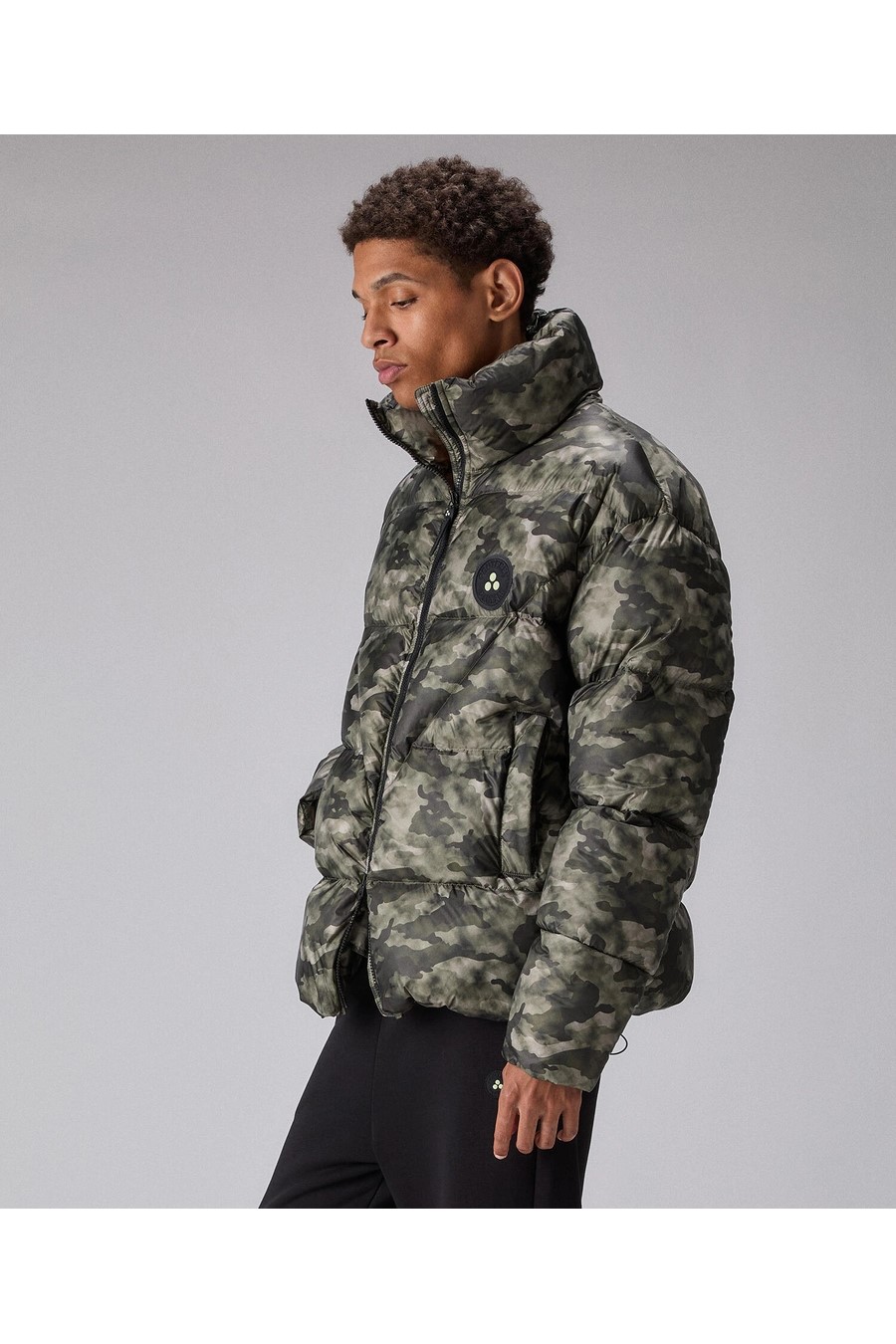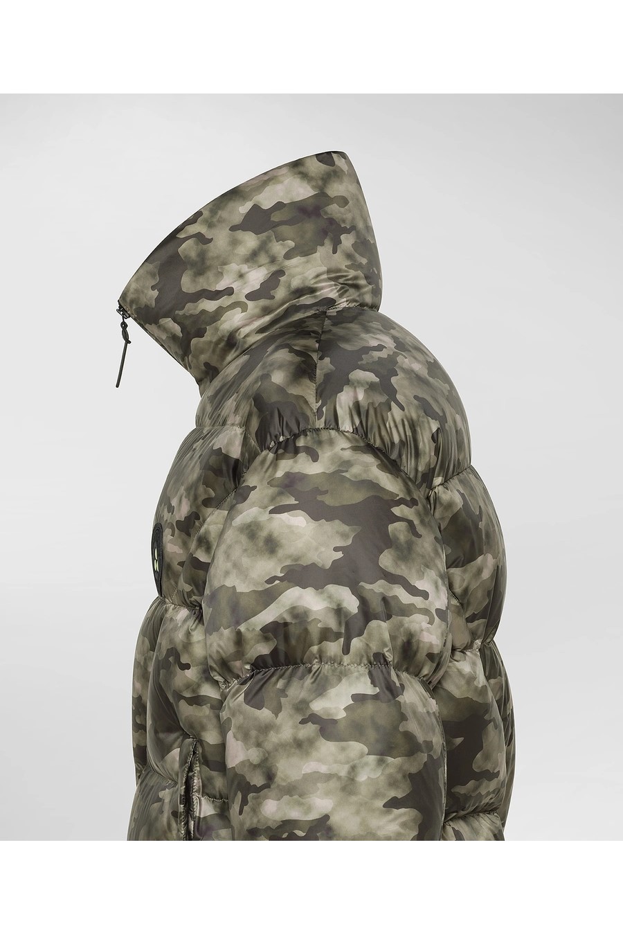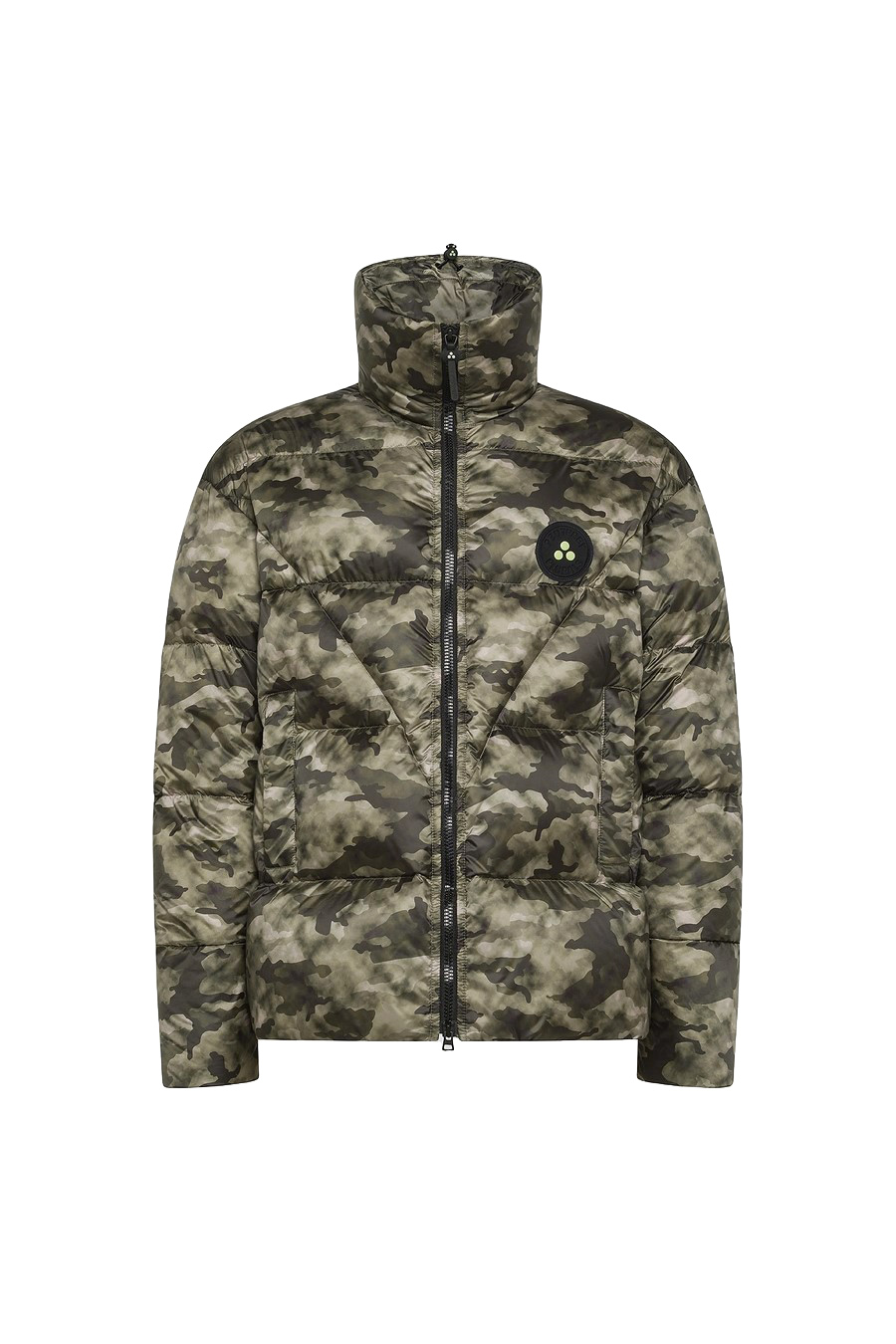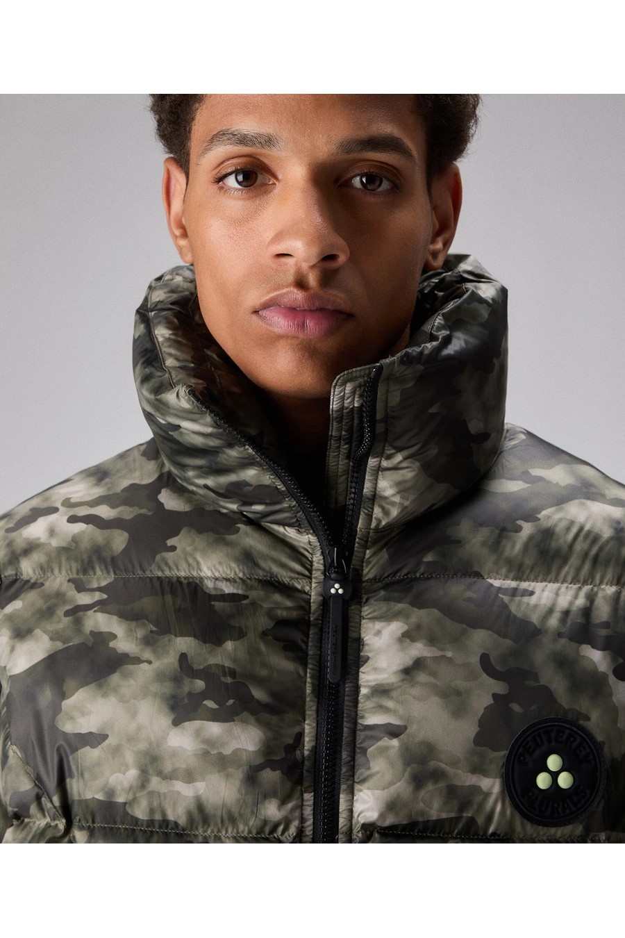 Peuterey camouflage puffer jacket made from 100% post-consumer recycled polyester, this high-neck puffer jacket has a semi-opaque texture, a fluid and soft feel, and a super compact structure. Certified natural down padding ensures lightweight warmth, with maxi quilting, a black double-slider central zip, side welt pockets and a round logo patch on the chest.